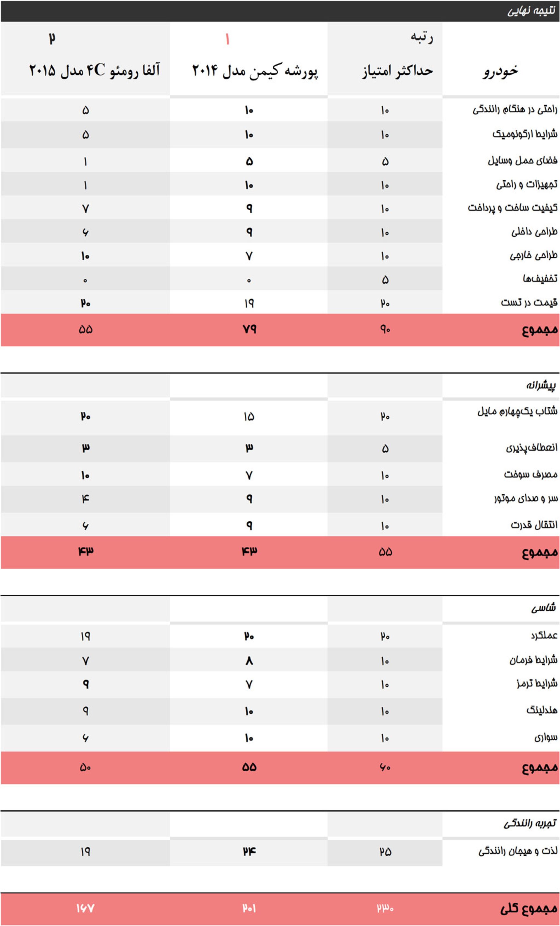 در انتها باید گفت که با اینکه کیمن، برخی تستهای کلیدی را به 4C واگذار کرده، ولی در کل برنده نهایی این مقایسه است. در ادامه نتایج کلی مقایسه دو خودرو را مرور میکنیم:
