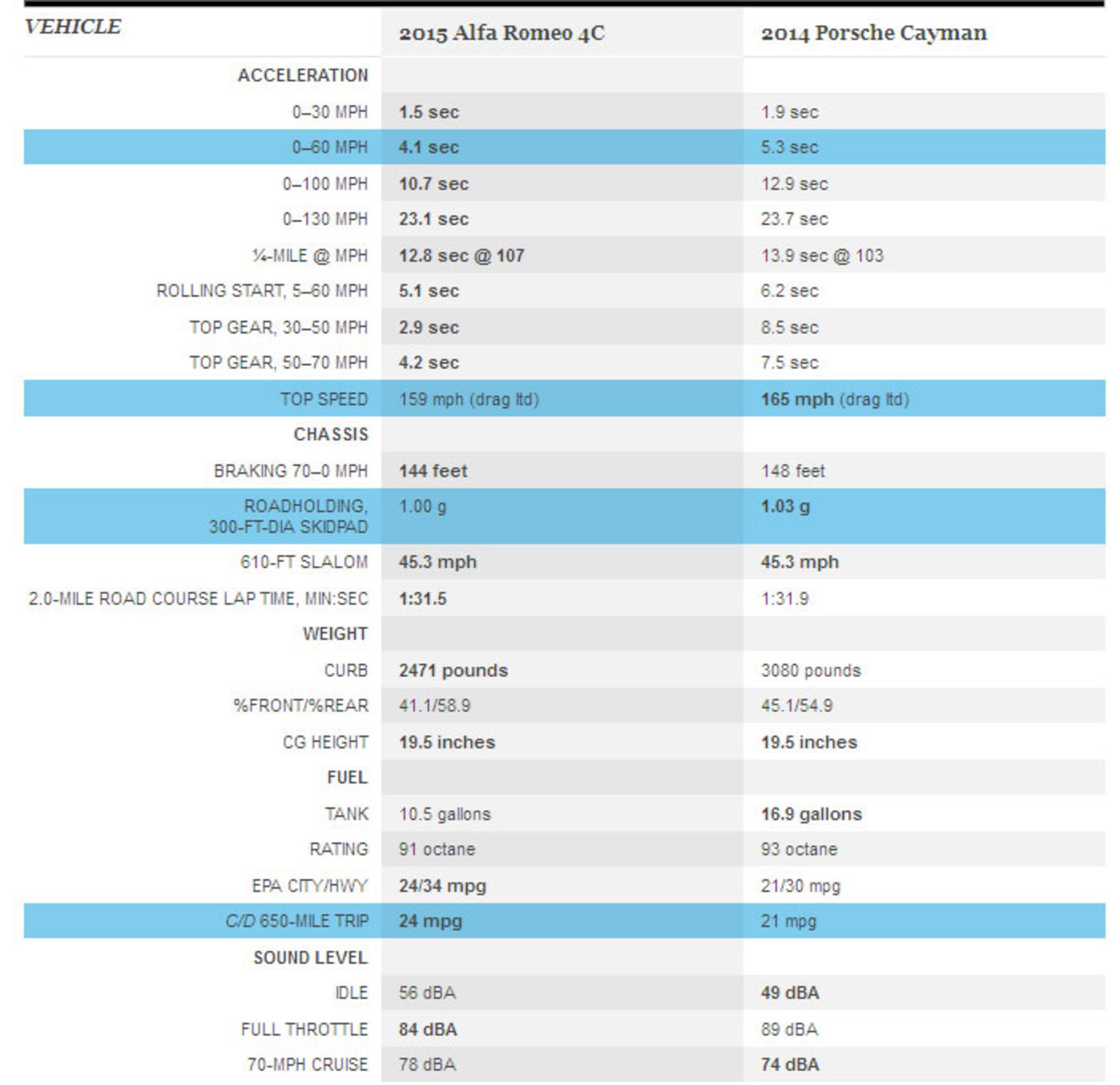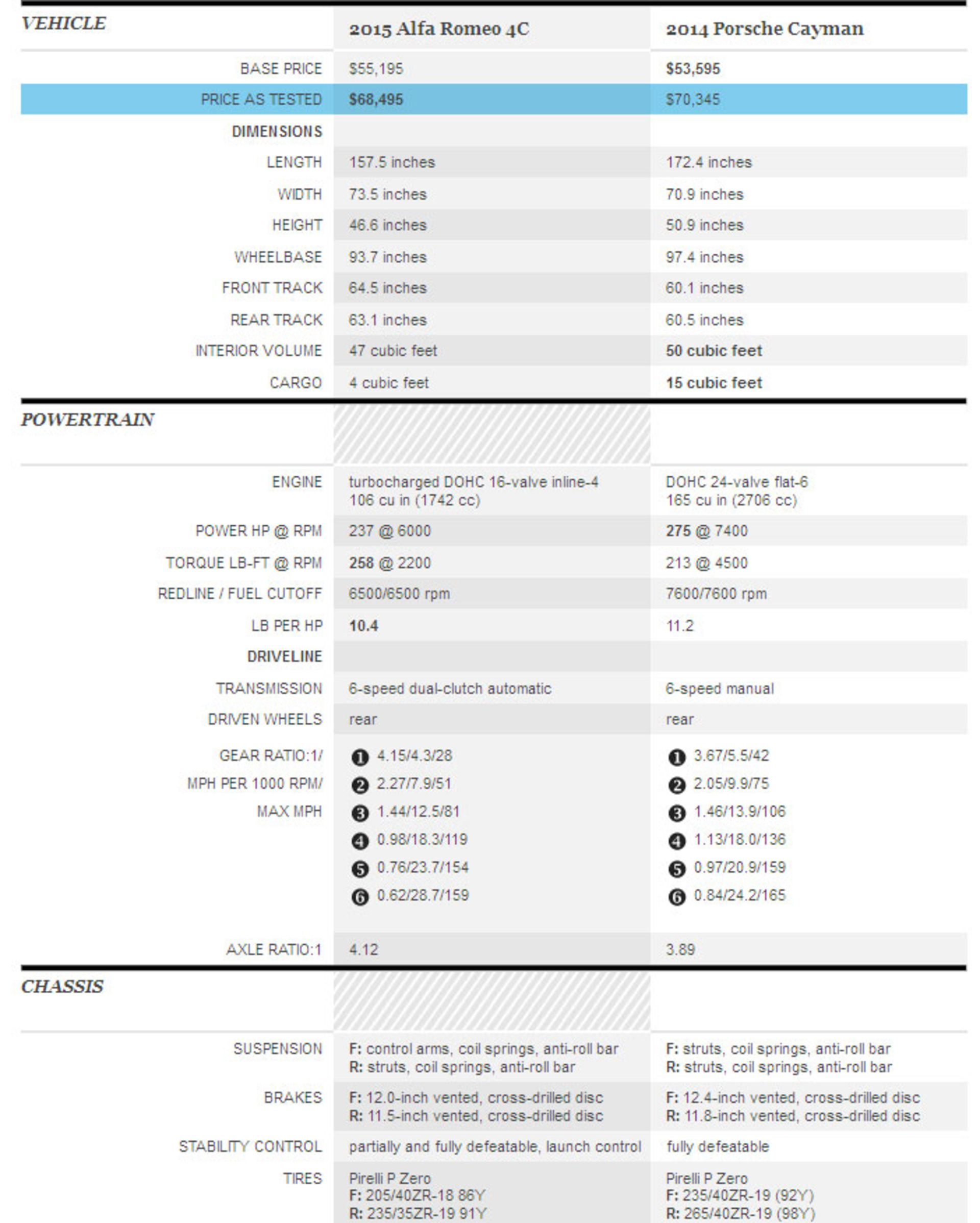 اول از همه باید گفت که در اینجا با خودروهای اسپرت و البته گرانقیمتی سر و کار داریم. آلفا 4C در رقابت با نسل دوم پورشه کیمن، هر دو قیمتی بالاتر از کوروت استینگری دارند. به منظور این مقایسه، مسیری به طول ۶۵۰ مایل (بیش از ۱۰۰۰ کیلومتر) پیموده شده و تمام تستهای عملکرد برای دو مدل انجام شده است. مثل همیشه، هدف شناسایی بهترین خودرو به شکلی همهجانبه و نه تنها عملکرد بهتر در تستی مانند یکچهارم و یا وضعیت بهتر در پیست مسابقه بوده است.
