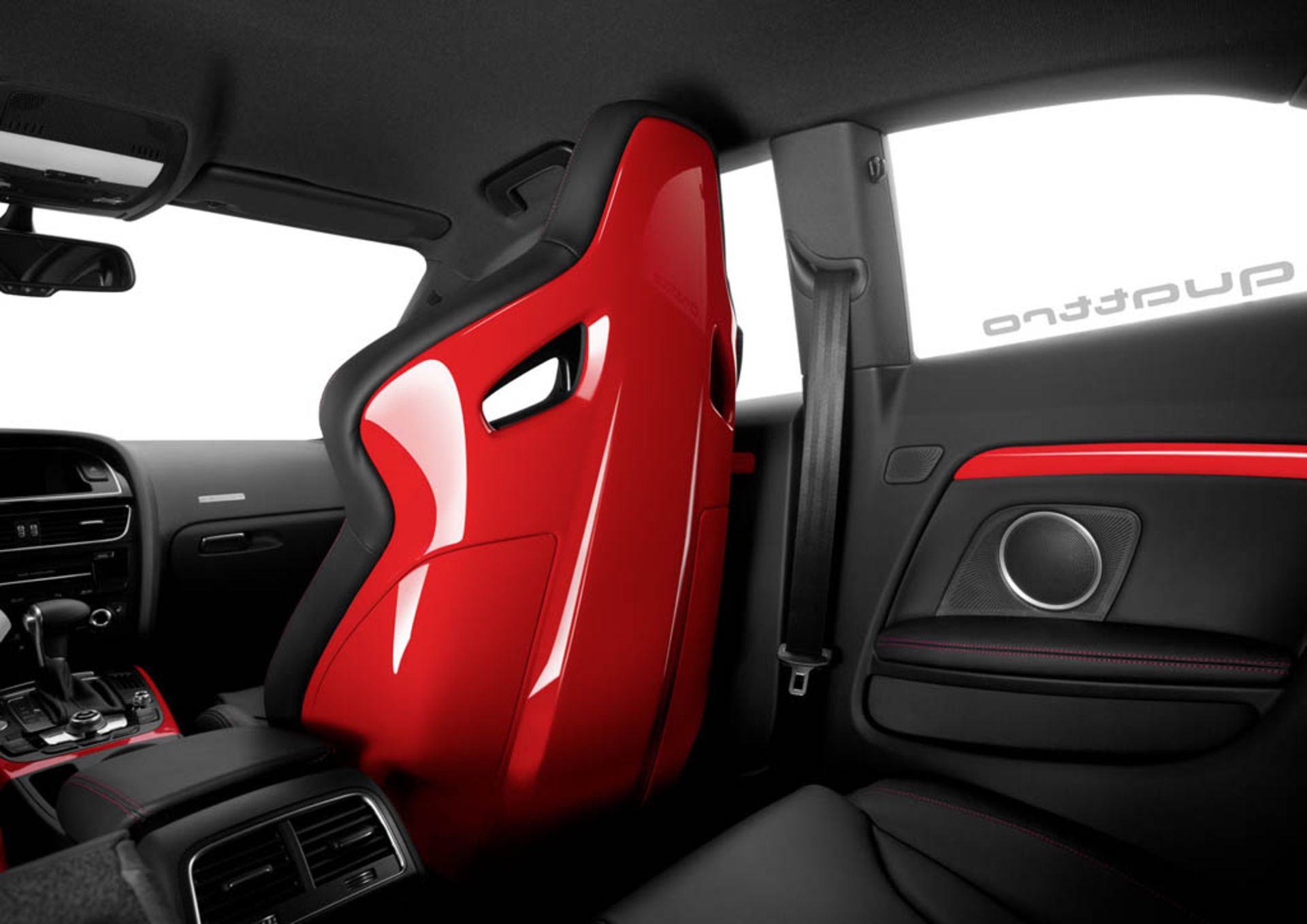 در داخل کابین یک جفت صندلی با پوشش پشتی قرمزرنگ که همان صندلی‌های مدل RS5 هستند قرارگرفته است و درب‌ها مجهز به یک پروژکتور که آرم DTM را بر روی زمین نمایش می‌دهد، هستند. همانند تمام مدال‌های آئودی اسپرت، A5 DTM هم از پنجره دودی عقب، استفاده از آرایش قرمز میسانو در تزیینات درب‌ها و نوار کناری کنسول وسط و استفاده از چرم آلکانترا با دوخت قرمزرنگ در ادوات و روکش صندلی برخوردار است.