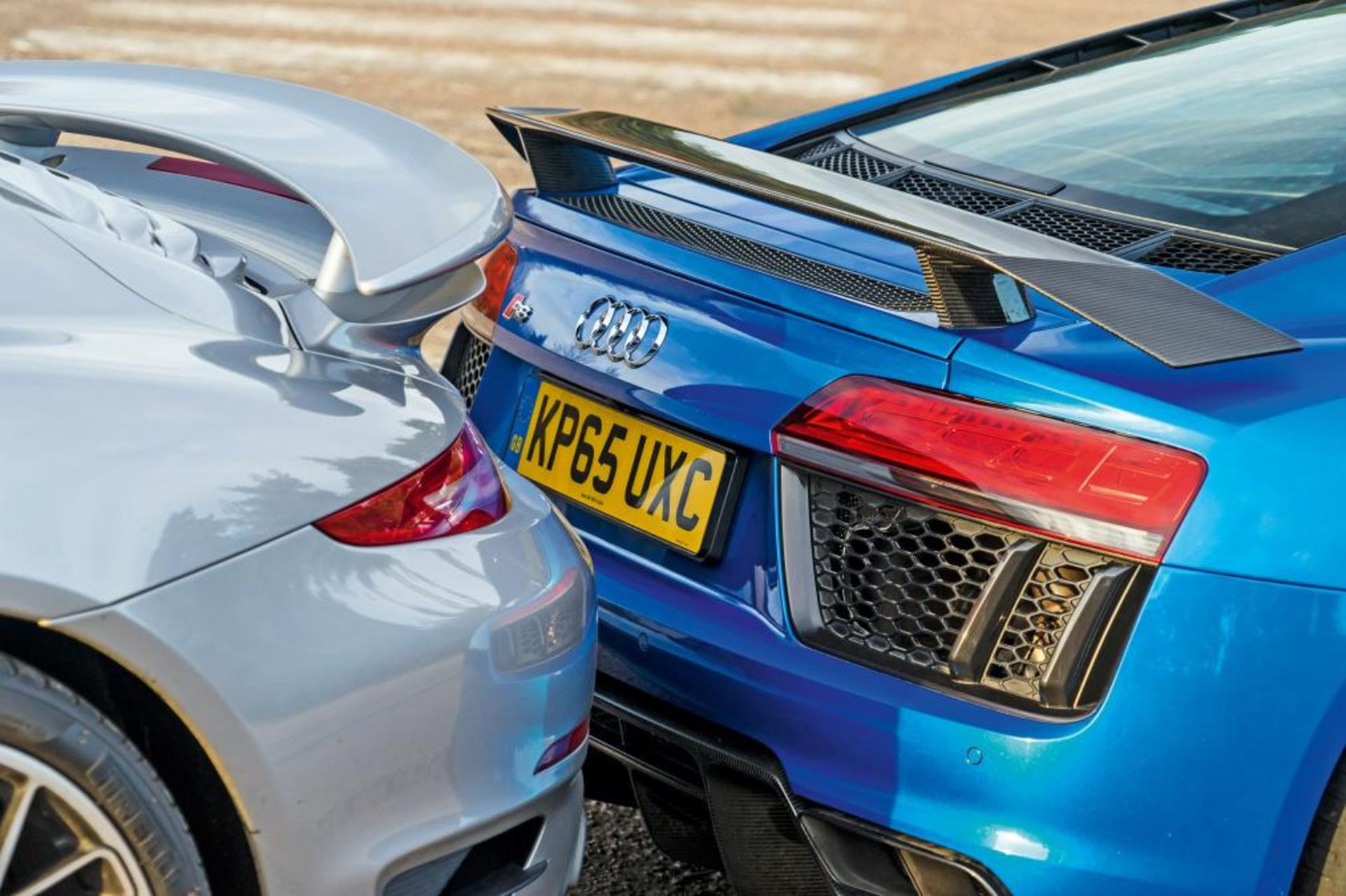 پورشه 911 توربو با پیشرانه شش سیلندر تخت 3.8 لیتری معروف خود که در عقب قرار گرفته و نیروی 552 اسبی به نظر شانسی در برابر موتور 10 سیلندر V شکل 5.2 لیتری آئودی با قدرت خروجی 602 اسب bhp ندارد. در عوض گشتاور 750 نیوتن متری پورشه بر گشتاور 560 نیوتن متری آئودی کاملاً چیره است. وزن پورشه 1605 کیلوگرم و وزن آئودی 1555 کیلوگرم است که برتری آئودی در نسبت قدرت به وزن نیز عیان است. با این حال پورشه 911 توربو S برای استفاده روزمره و در هرگونه شرایط آب و هوایی، بهترین گزینه سوپراسپرت ها محسوب میشود.
