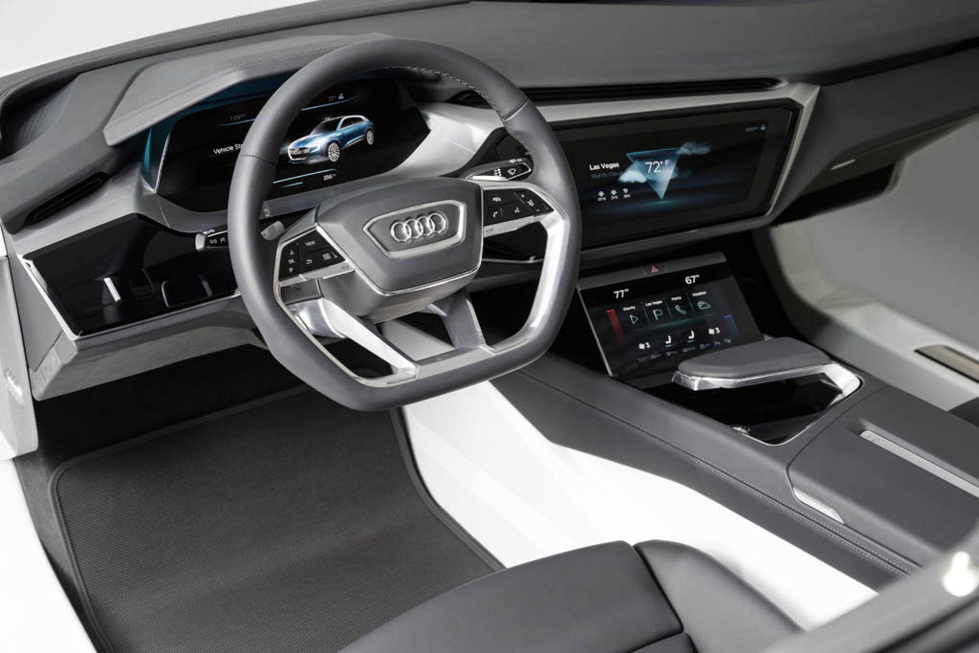 این برند چهار حلقه، همچنین با نمایش کانسپت ای-ترون کواترو با پیشرانهای الکتریکی متشکل از سه موتور برقی و حداکثر خروجی برابر ۵۰۳ اسببخار همراه بوده است. ضمن اینکه قدرت این کانسپت به هر چهار چرخ خودرو انتقال داده میشود. دامنه مسافت رانندگی با این خودروی الکتریکی به ۵۰۰ کیلومتر با استفاده از یک بار شارژ کامل باتری میرسد؛ باتریهایی که در کف خودرو و بین دو محور قرار گرفتهاند.