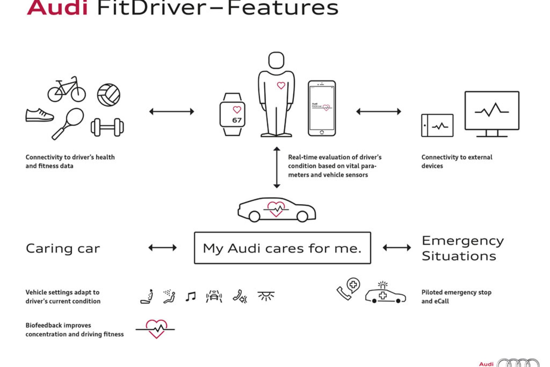 تکنولوژی بعد در لیست آئودی برای CES، یک سیستم «راننده آماده آئودی» است که بر حالت مناسب راننده تأکید دارد. این سیستم، دادههای مختلف مربوط به سلامتی راننده از جمله ضربان قلب و درجه حرارت پوست را بررسی میکند و در مورد خستگی یا تحت فشار بودن وی تصمیم میگیرد. سپس بر این اساس، سیستمهای وسیله نقلیه به حالتها و عملکردهای «راحت، تحریککننده و یا محافظت از راننده» تنظیم میشوند.