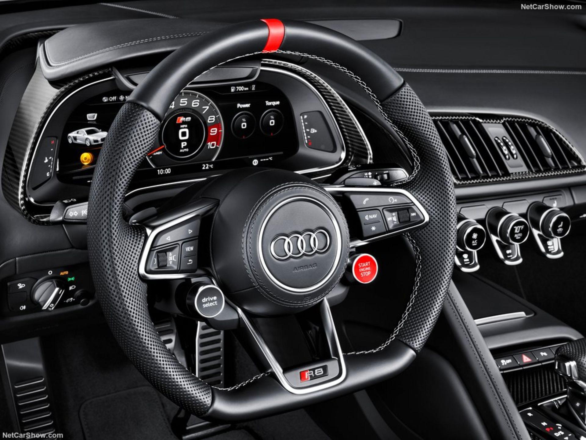 هنگام باز کردن درِ ماشین در ابتدا با رو رکابیهای چراغدار به همراه برچسب Audi Sport و پلاک حاوی شمارهٔ تولید محدود مورد استقبال قرار میگیریم درحالیکه بعدازآن پوشش چرم ناپا بر روی صندلیها و تریم رو دریها با بخشهایی قرمزرنگ جلبتوجه میکنند. علاوه بر این، علامت R8 بهصورت برجسته روی پشتی صندلیها نقش بسته است که همراه با دوخت برجستهٔ نقرهای، تریم فیبر کربنی براق و امکانات دیگر، از ویژگیهای انحصاری این R8 تولید محدود هستند.