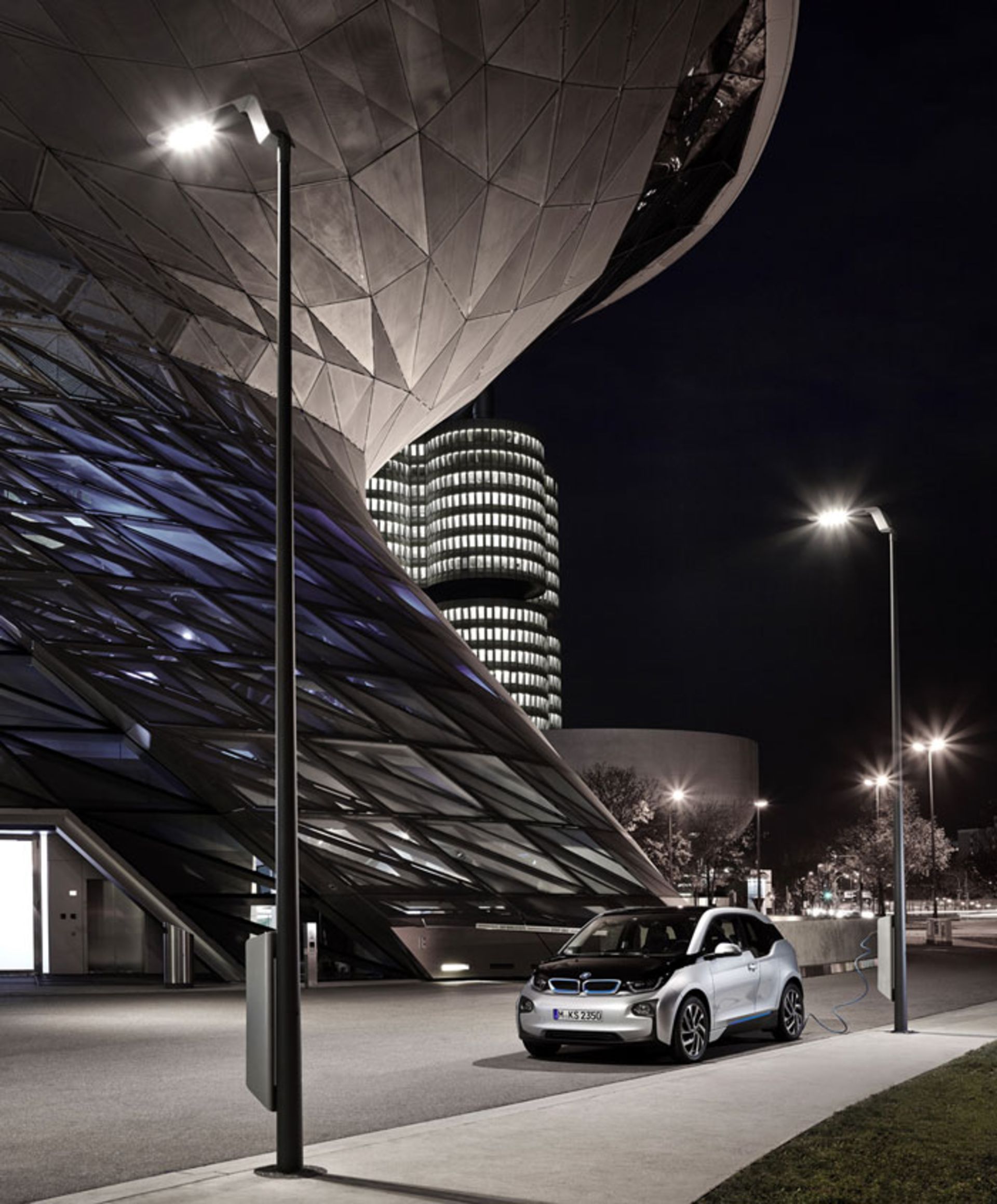 چراغ و شارژ. استفاده از چراغهای LED برای روشنایی خیابان و فراهم کردن امکان شارژ خودروها از طریق تیرهای چراغ برق.