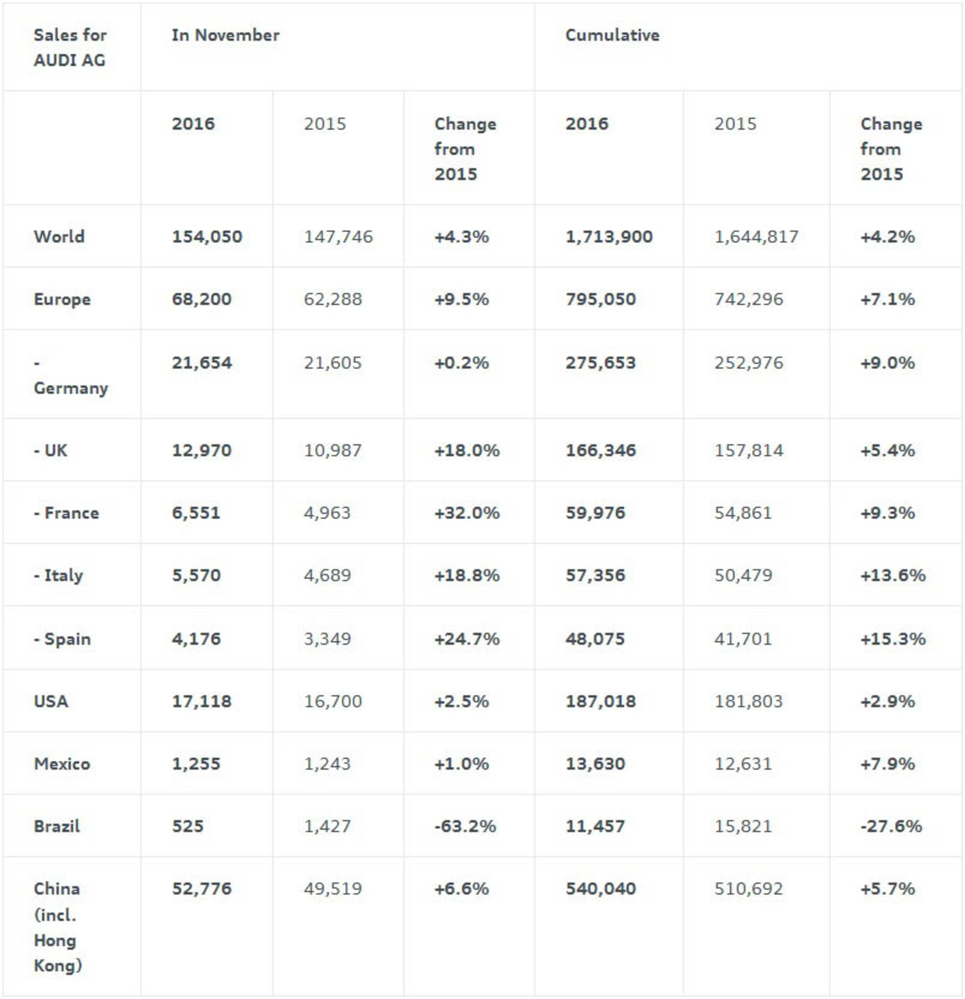 از سوی دیگر آئودی نیز با مدلهای جدید Q2 و A5 در میدان حاضر بود و در ایالاتمتحده نیز Q7 در میان پرفروشها جولان میدهد. در مجموع این برند در ماه نوامبر فروش 154,050 دستگاهی را ثبت کرده که نسبت به ماه مشابه سال پیش رشد 4.3 درصدی را نشان میدهد.