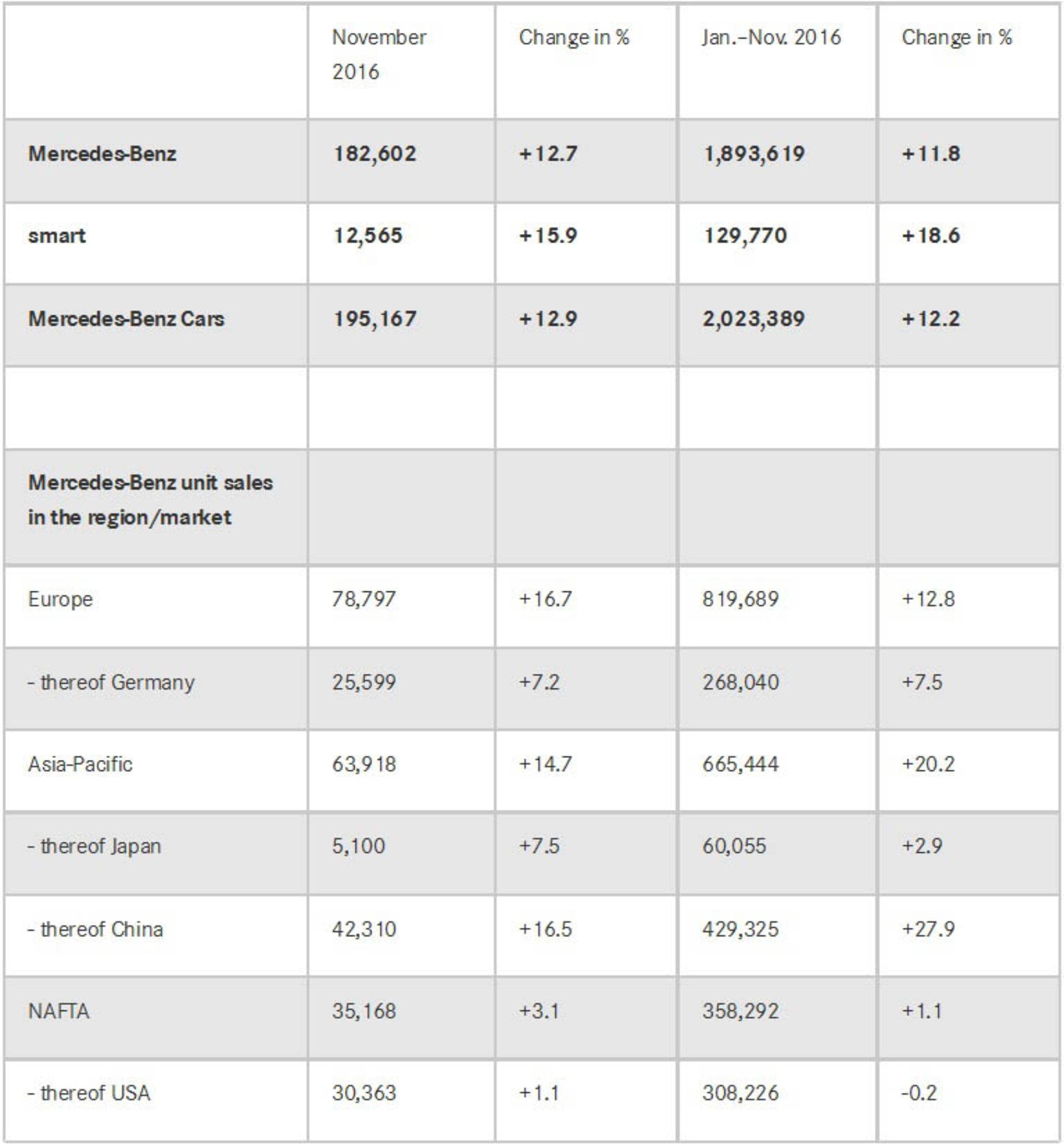 مدلهای سدان و استیت C کلاس پرفروشترین خودروهای مرسدس در ماه نوامبر بودهاند به گونهای که 182,602 دستگاه از این دو مدل در سراسر جهان تحویل مشتریان شده که رشد 12.7 درصدی را نشان میدهد. تقاضا برای سدان E کلاس جدید نیز بالا بوده و البته رشد فروش و تقاضای قابلتوجهی برای شاسی بلندهای شرکت مخصوصاً مدل GLC وجود دارد.