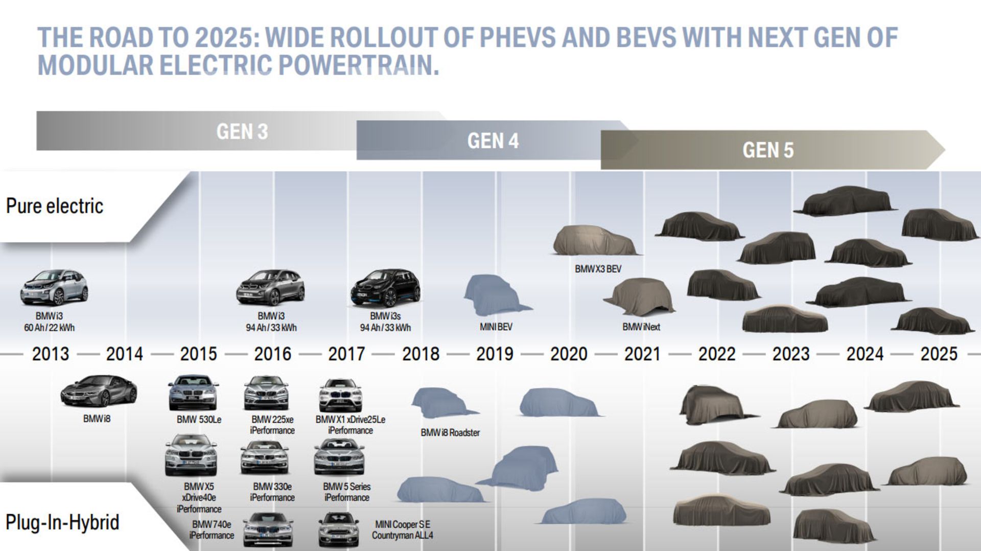 مینی بهعنوان یکی از زیرمجموعههای گروه بامو در سال 2019 یک خودروی الکتریکی را معرفی خواهد کرد و سپس در همان سال دو یا سه محصول پلاگینهیبریدی هم به آن خواهند پیوست. در سال 2020 هم بامو نسخهٔ تمام الکتریکی X3 را معرفی خواهد کرد درحالیکه امکان ساخت نسخهٔ پلاگینهیبریدی آنهم وجود دارد. این حرکت سبز در سال 2021 با معرفی عضو جدید خانوادهٔ i ادامه خواهد یافت و پسازآن با معرفی 9 خودروی تمام الکتریکی دیگر تکمیل خواهد شد. همچنین در سال 2022 میتوان انتظار دیدن سه دستۀ مختلف از محصولات پلاگینهیبریدی در گروه بامو را داشت. این در حالی است که در طول سه سال آینده بامو پنج مدل پلاگینهیبریدی دیگر را هم به سبد محصولات خود اضافه خواهد کرد.