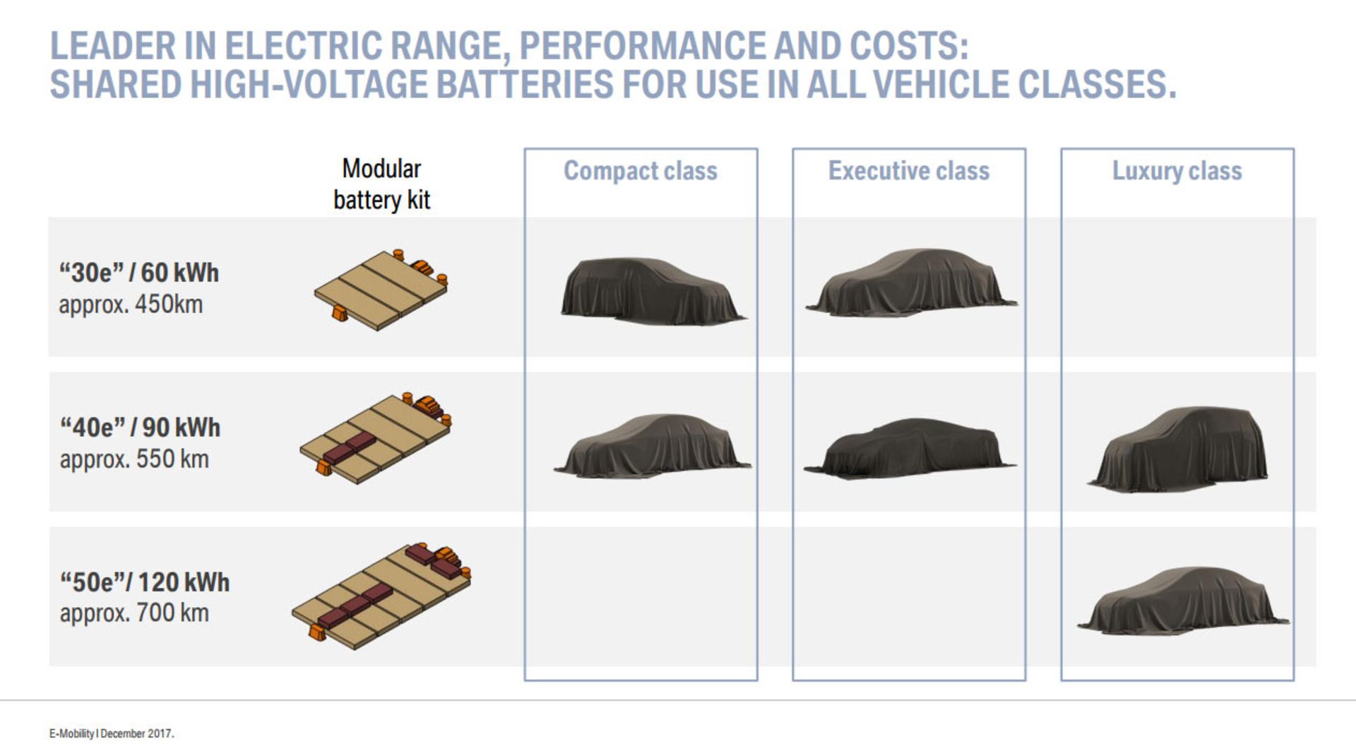 محصولات ساخت بامو از سال 2021 با پیشرانههای درونسوز، قوای محرکهٔ تمام الکتریکی و سیستمهای تمام الکتریکی سازگاری خواهند داشت. نسخهٔ الکتریکی این خودروها دارای ساختار سبکوزن آلومینیومی خواهند بود که در خود موتورهای الکتریکی، گیربکس تک سرعته و دیگر سیستمهای الکترونیکی را جای خواهد داد. همچنین این محصولات برای استفاده از باطریهای ماجولار طراحی خواهند شد که ظاهراً در سه سایز مختلف ارائه میشوند. نسخههای 30e و 40e در محصولات کلاس کامپکت و اجرایی مورداستفاده قرار خواهند گرفت. نسخهٔ اول مجهز به باطریهای 60 کیلووات ساعتی خواهد بود که بُردی برابر با 450 کیلومتر را ارائه میکند درحالیکه نسخهٔ 40e از باطریهای 90 کیلووات ساعتی با بُرد 550 کیلومتر استفاده خواهد کرد.