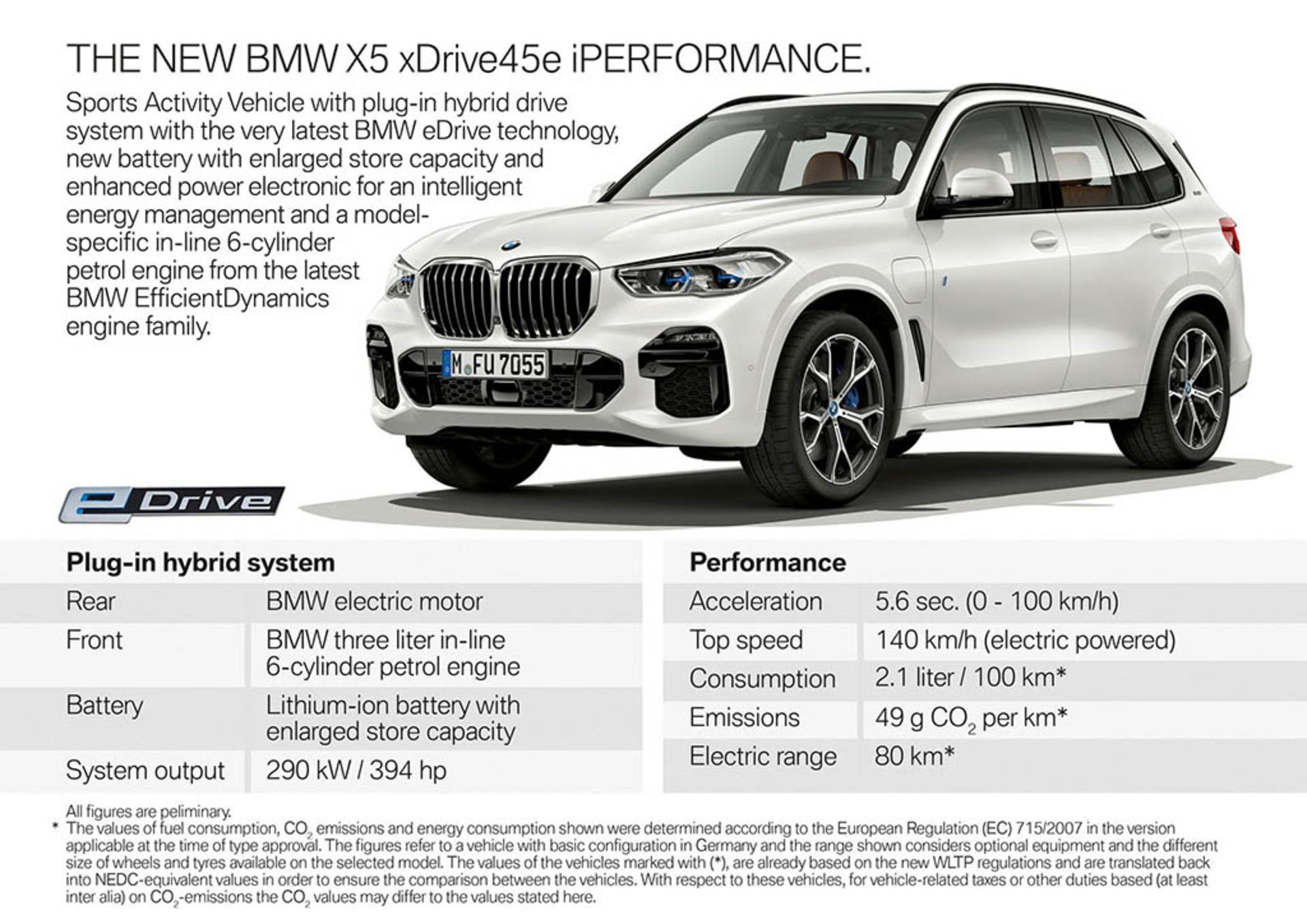 بامو X5 xDrive45e iPerformance جدید که از سال آینده وارد بازار اروپا خواهد شد نسخهی پلاگین هیبریدی از این شاسیبلند لوکس است که دارای پیشرانه 6 سیلندر 3 لیتری توربوی توئین پاور با قدرت 282 اسب بخار و یک پیشرانه الکتریکی با قدرت 110 اسب بخار است. قدرت ترکیبی این شاسیبلند جدید به 388 اسب بخار و گشتاور آن نیز به 600 نیوتون متر میرسد.