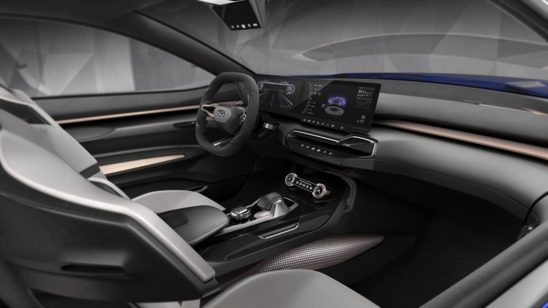 نمای زیبا و لوکس بیرونی این ماشین به داخل آن‌هم کشیده شده و در اینجا شاهد صندلی‌های شناور، کنسول مرکزی که به‌طور کامل در طول کابین کشیده شده، دو صفحه‌نمایش دیجیتالی، غربیلک فرمان ضخیم، کنترلرهای ساده و سقف شیشه‌ای هستیم.