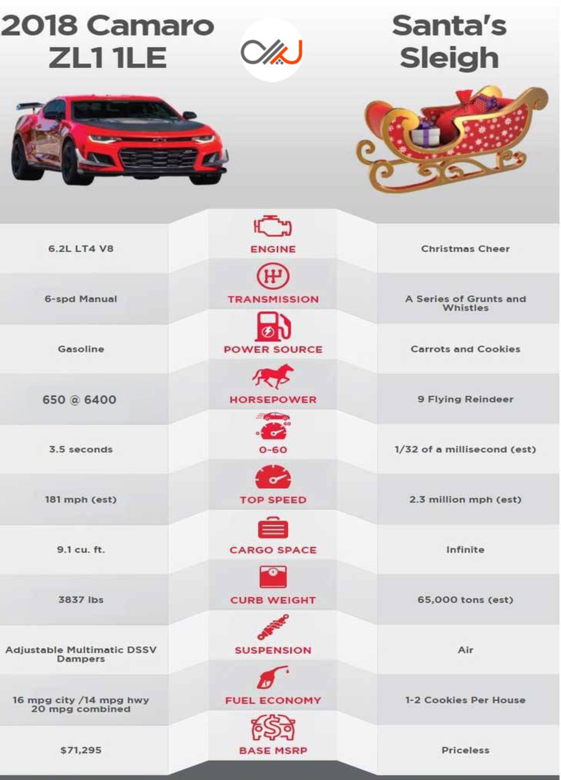 در این تصویر شاهد یک خطای عددی فاحش در میزان قدرت کامارو بودیم که تنها 275 اسب بخار ذکر شده بود درحالی‌که قدرت پیشرانه 6.2 لیتری ZL1 به 650 اسب بخار می‌رسد. شاید هم مرکز قطعات جنرال موتورز می‌خواسته تا به سورتمه بابانوئل شانسی در مسابقه با کامارو دهد. خوشبختانه این خطا خیلی زود اصلاح شد. شتاب صفر تا 96 کیلومتر در ساعت سورتمه هم 32/1 میلی‌ثانیه ذکر شده که مطمئن هستیم بابانوئل با آن می‌تواند در جهنم سبز به راحتی جولان دهد.