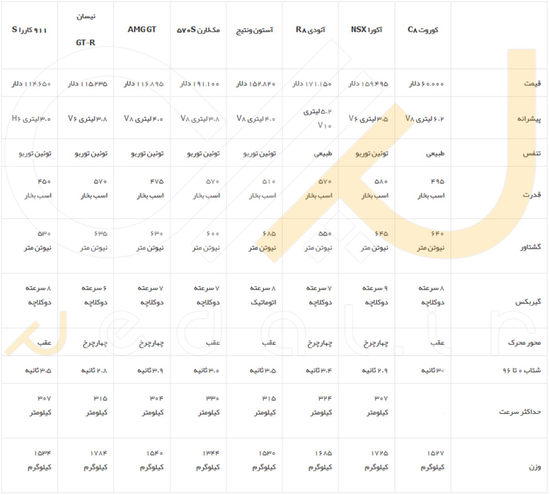 کوروت C8 | آکورا NSX | آئودی R8 | آستون ونتیج | مکلارن 570S | AMG GT | نیسان GT-R | 911 کاررا S | |