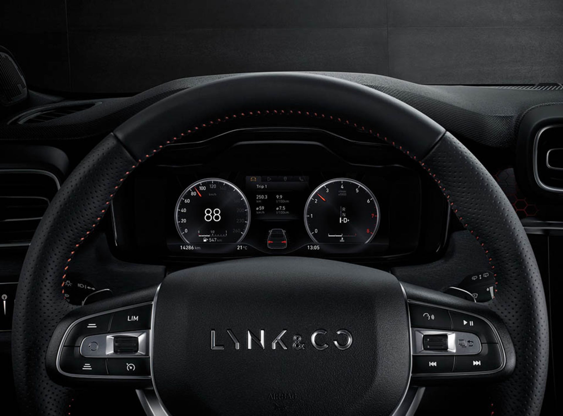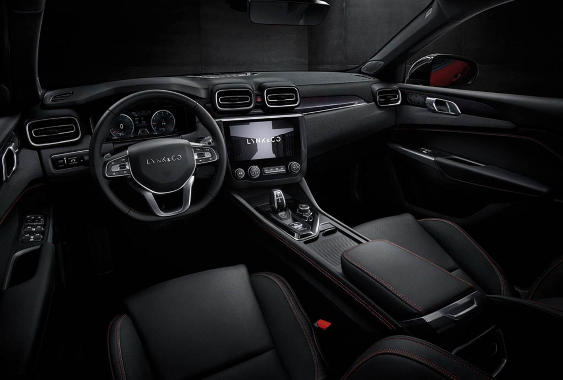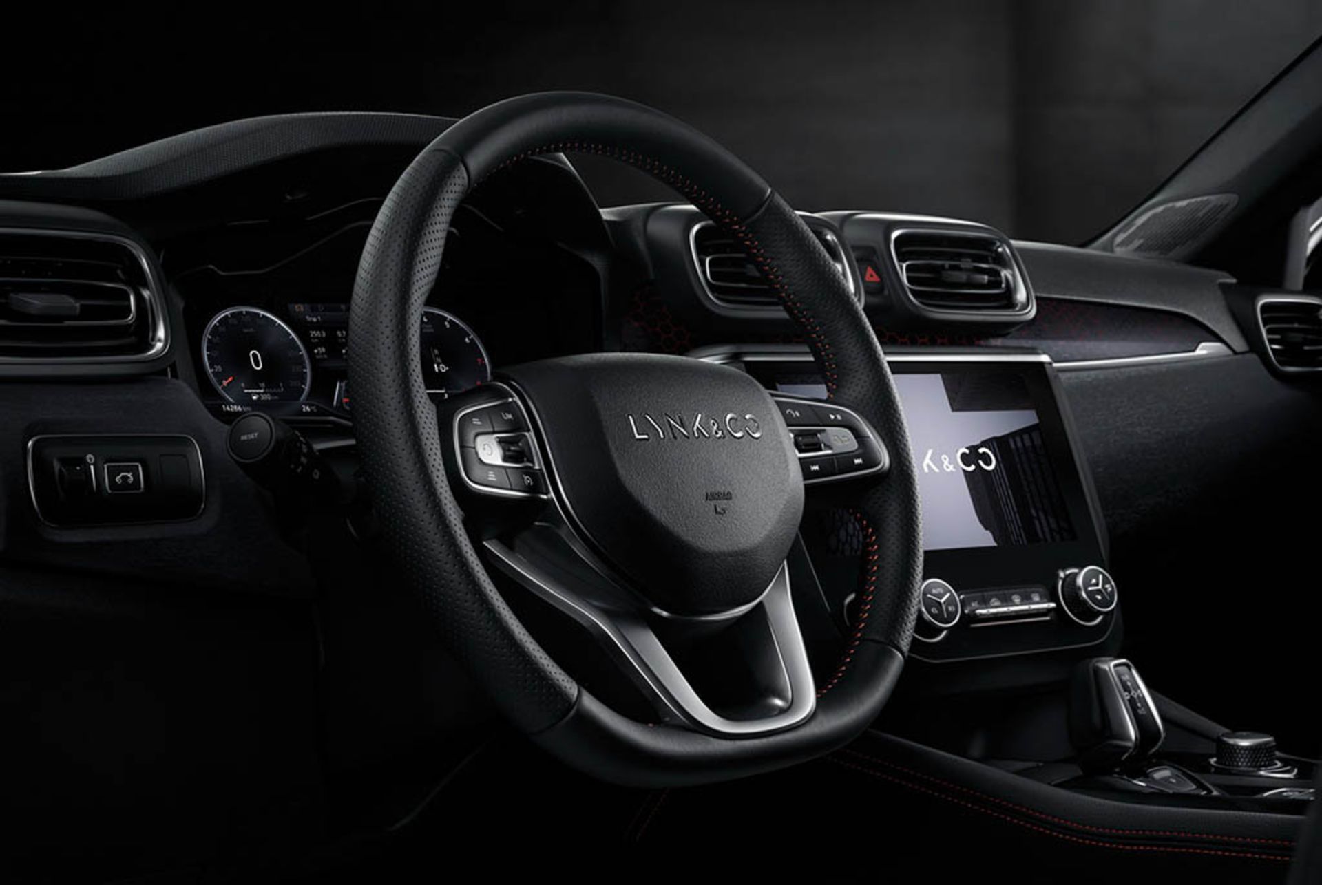 دکمه‌ها و اهرم‌های فیزیکی کمی در کابین وجود داشته و موارد موجود نیز برای سیستم تهویه مطبوع بکار می‌رود. لینک اند کو می‌گوید کابین سدان جدید خود دارای اولین دکمه‌ی اشتراک، شارژ بی‌سیم و ذخیره برنامه‌های موبایلی در تاریخ صنعت خودرو می‌باشد. این کمپانی همچنین ارتباط رایگان داده‌های ترافیکی را ارائه می‌کند بنابراین خودروی شما همیشه به اینترنت متصل خواهد بود.