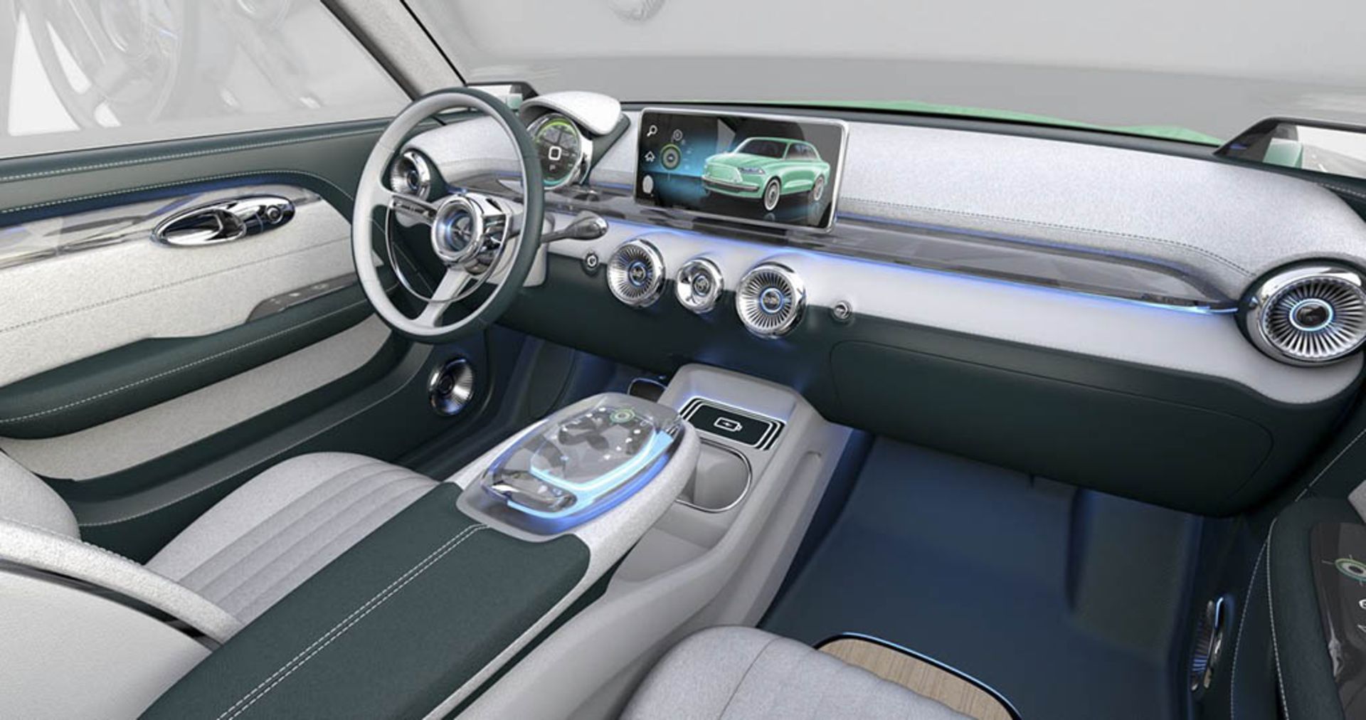 داخل کابین نیز رترو و درعین‌حال مدرن بوده و از فرمان سه پره بزرگ با دکمه‌هایی در بخش‌های بالایی سود می‌برد. ورودی‌های هوا نیز توربین مانند طراحی شده و دکمه‌های سیستم تهویه مطبوع در مرکز داشبورد قرار دارند. پشت آمپرهای گرد و دیجیتال و صفحه‌نمایش بزرگ داشبورد نیز جزو دیگر ویژگی‌های برجسته کابین هستند.