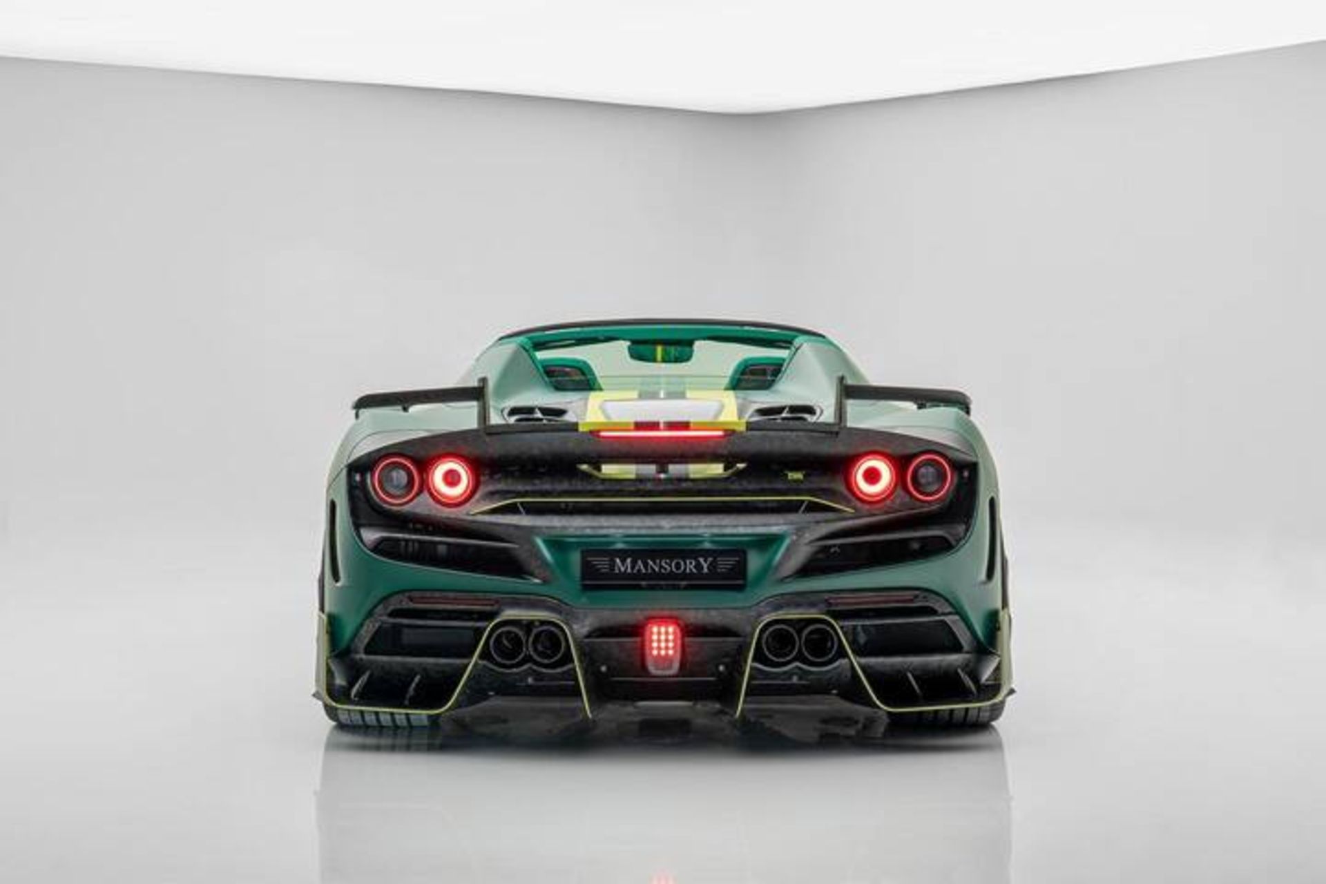 در کنارههای این سوپر اسپرت ایتالیایی نیز تغییراتی رخ دادهاند که واضحترین آنها رینگهای افترمارکتی با پرههای مشکی و تریم فیبر کربن فورج کاری شده است. آینهها، دستگیره دربها و ورودیهای هوای جانبی نیز از جنس کربن فورج کاری شده هستند. وقتی به پشت منصوری F8XX اسپایدر نگاه کنید یک جفت بالچه از همان جنس قطعات قبلی را خواهید دید که این قطعات از فراری FXX K الهام گرفتهاند. دیفیوزر عقب دگرگون شده با چراغ باران بزرگ و چهار خروجی اگزوز نیز تکمیل کننده کار هستند.