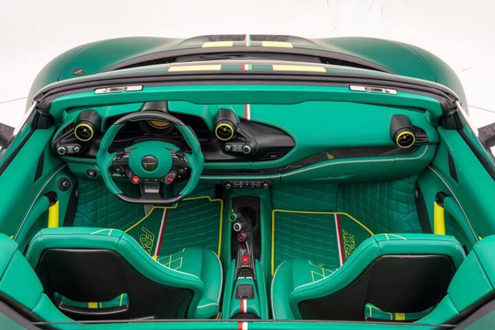 این خودرو که تماشا میکنید از رنگ سبز و عناصر زرد رنگ سود میبرد. مشتریان میتوانند رنگ بدنه را به دلخواه خود شخصیسازی کنند و از این نظر محدودیتی وجود ندارد. کابین هم تغییراتی داشته و تقریباً تمامی سطوح بازنگری شدهاند و چرم سبز روشن در آنها به چشم میخورد. از جمله این بخشها میتوان به صندلیها، داشبورد، پانل دربها و فرمان اشاره کرد. این فراری همچنین از دستگیره دربهای زرد روشن، ورودیهای هوا با تریم زرد و... سود میبرد. تغییرات فنی مدل کوپه در برادر اسپایدر هم دیده میشوند و به همین خاطر نیروگاه 8 سیلندر 3.9 لیتری توئین توربوی این خودرو قدرت 880 اسب بخاری و گشتاور 980 نیوتون متری تولید میکند.