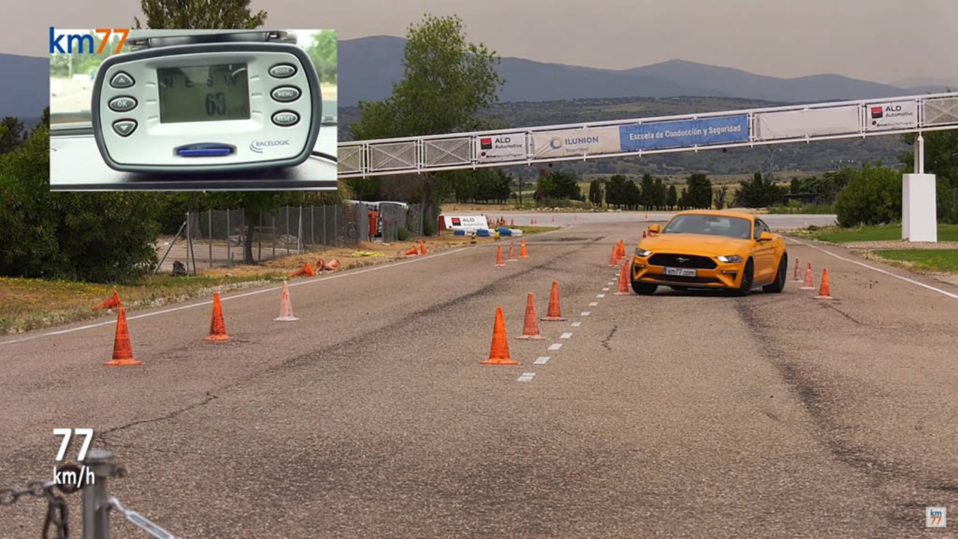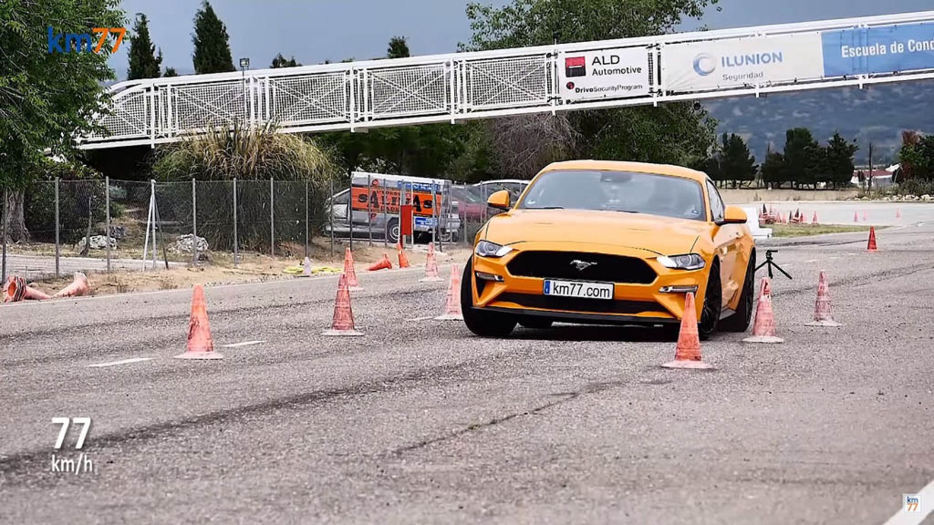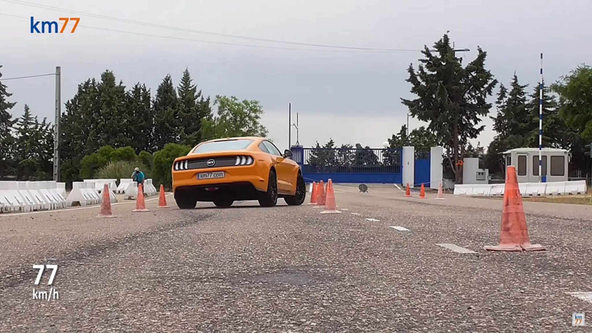 ویدئو با نشان دادن موستانگی که با مخروطها برخورد کرده و نمیتواند مسیر خود را سریعاً تصحیح کرده و در مسیر خود باقی بماند شروع میشود. سرعت خودرو در این تست 77 کیلومتر در ساعت بوده است. البته بنا به گفتهی مجری، راننده باید از هندلینگ خودرو اطلاع داشته باشد. پس از گذشت زمان، راننده توانسته با موفقیت این تست را پشت سر بگذارد.