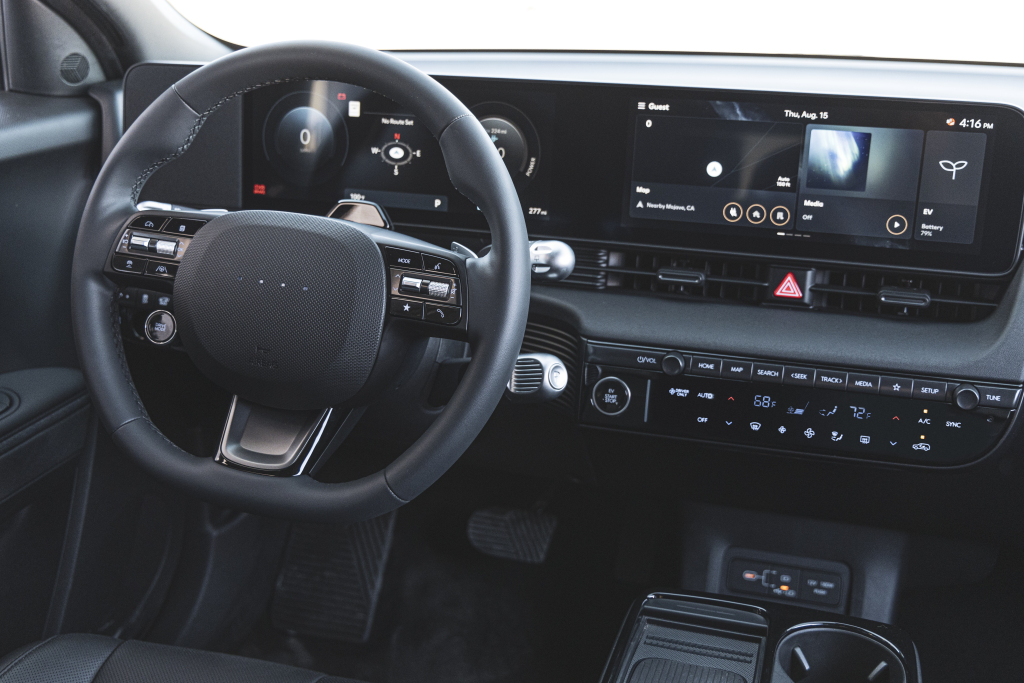 هیوندای آیونیک ۵ از دو نمایشگر 12/3 اینچ پیوسته استفاده میکند. فرمان شکسته تفاوت خاصی با دیگر خودروهای هیوندای ندارد؛ اما حالت صاف و کاملا افقی برای تودریها، عجیب به نظر میرسد. خطوط افقی و کاملا موازی در فضای داخلی آیونیک 5 تاکید شدهاند. این حالت در کنسول بین صندلیها و جالیوانیها دیده میشود.