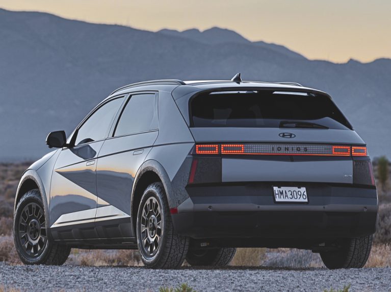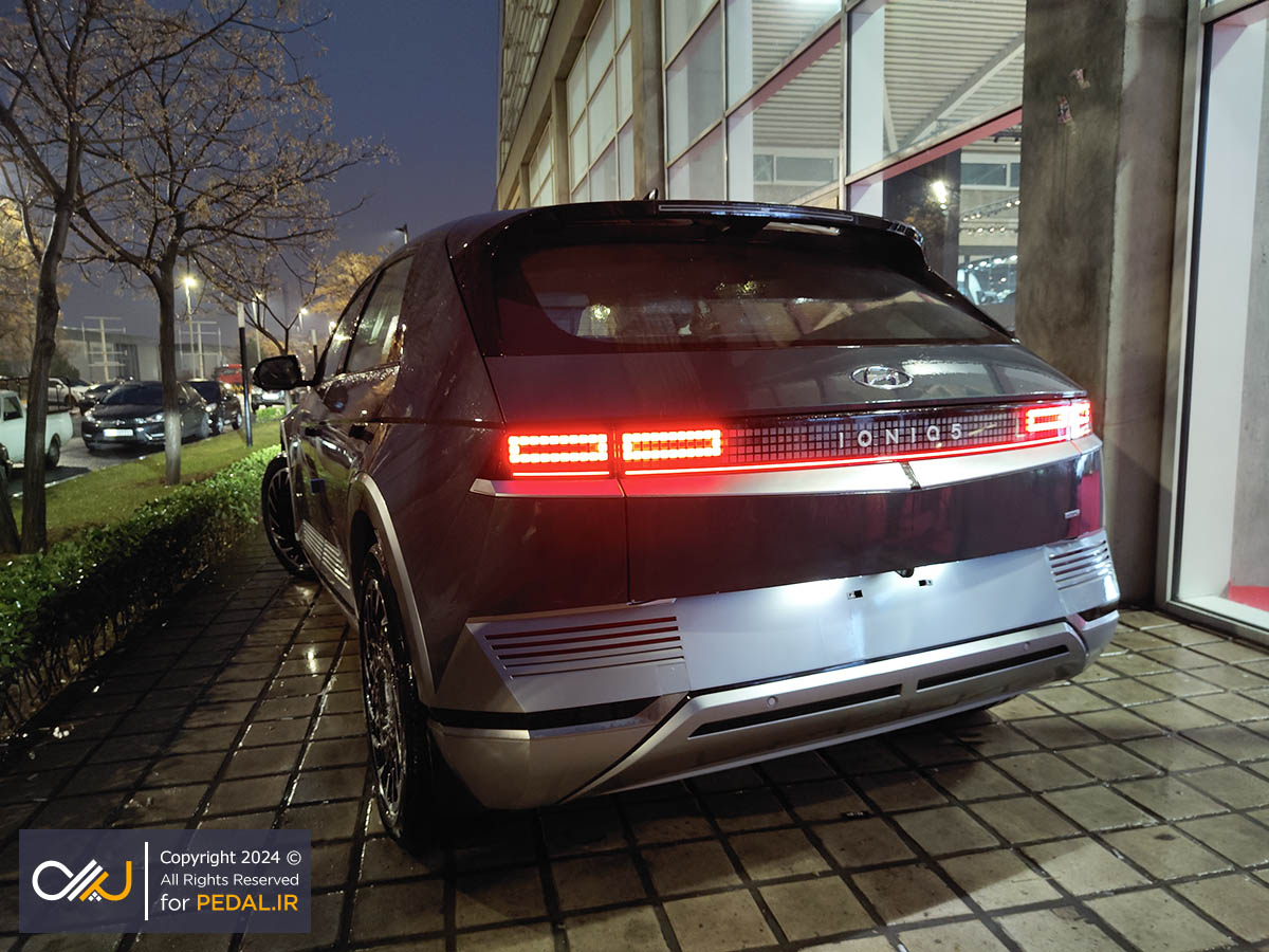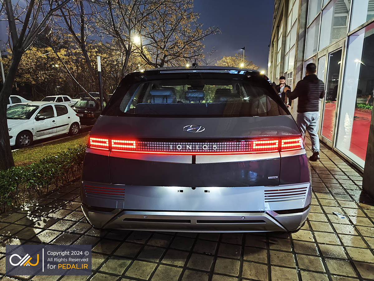 سبک چراغهای جلو در پشت آیونیک 5 نیز دیده میشود. چند LED مربعی، روشنایی این قسمت را تامین میکنند. خطوط شکسته و زاویههای تند، در نمای عقب شدت زیادی دارند تا حجمدهی فضایی برای آیونیک 5 فراهم شود. سپر سیاه پلاستیکی، مهمترین نکتهی منفی در طراحی این خودرو است.