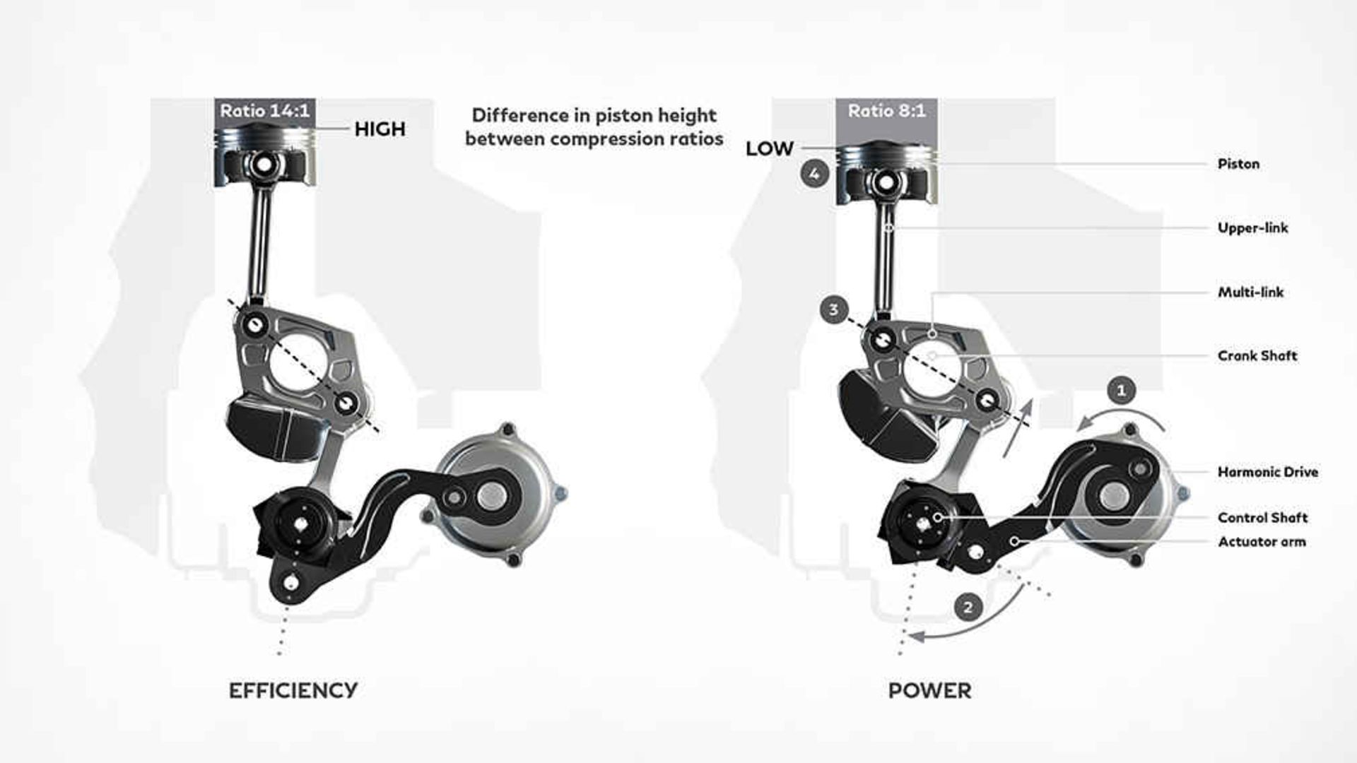 تکنولوژی فشردهسازی یا کمپرس متغیر موتور، چیز تازهای نیست اما عملی کردن آن در مقیاس انبوه و تجاری تاکنون میسر نشده بود. موتور چهار سیلندر 2.0 لیتری توربوی بنزینی اینفینیتی، میتواند به اندازه یک موتور V6 قدرت تولید کند و در عین حال سبکتر و کوچکتر از آن نیز هست. بعلاوه راندمان این پیشرانه مشابه یک موتور دیزلی مدرن امروزی است.