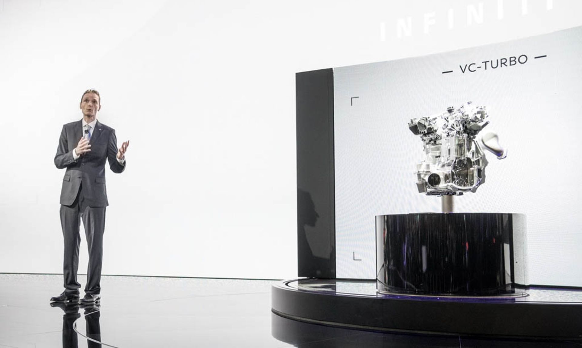 اینفینیتی در نمایشگاه پاریس با موتور توربوی جدید از سری VC خود، تکنولوژی و توانایی فنی بالای خود را به رخ کشیده است. این پیشرانه، نخستین موتور تولید انبوه جهان با فناوری ضریب کمپرس متغیر است.