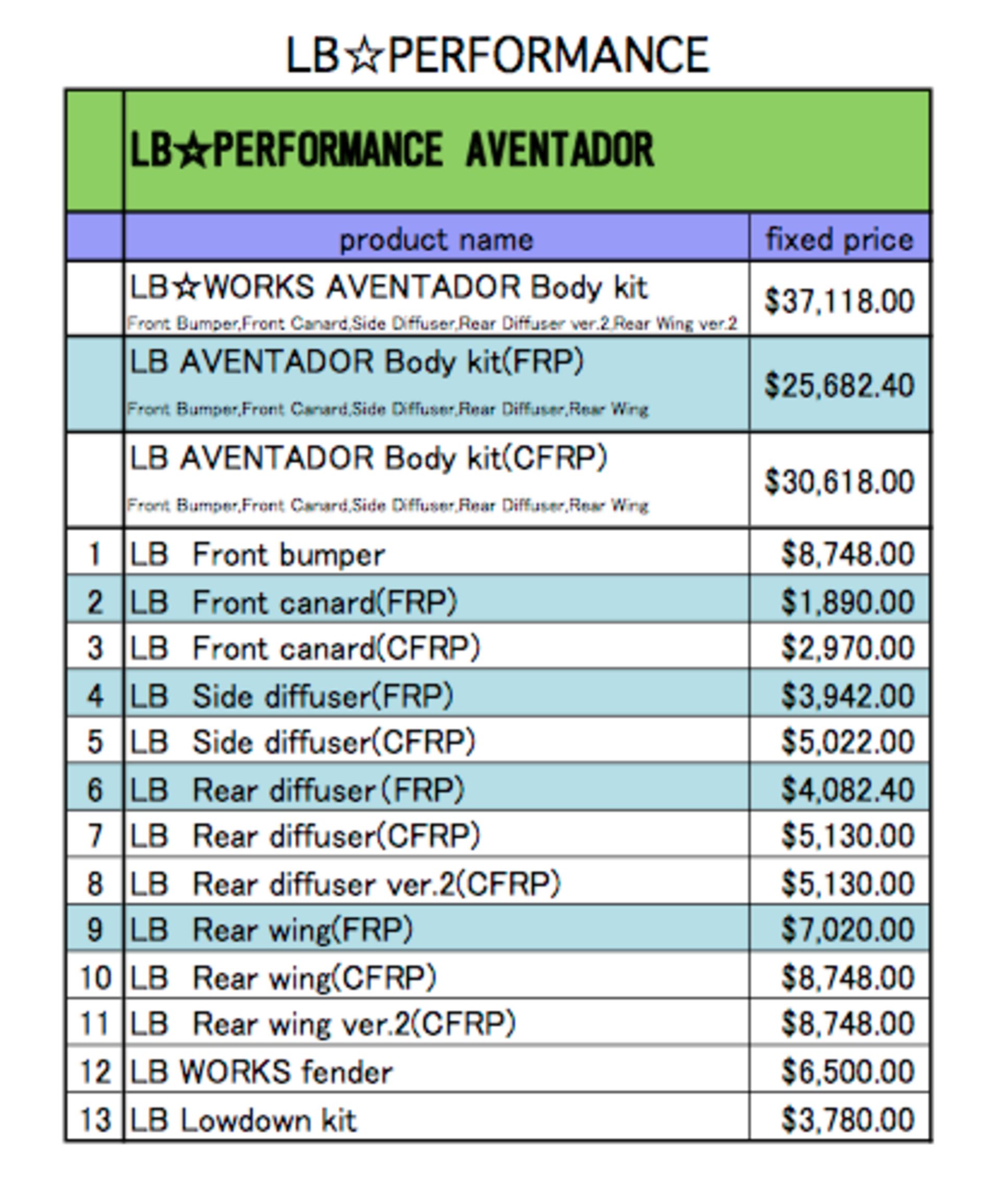 تیونر ژاپنی لیبردی، کیت بدنه این خودرو را با همکاری LB Performance ساخته که جزییاتی مانند سپرهای جدید، رکاب ها، گلگیرهای عضلانی و قطعات کربنی در جلو و عقب در آن براحتی قابل تشخیص است. قیمت کامل این کیت بدنه 29,000 یورو (معادل تقریبی 37,000 دلار) اعلام شده اما با این حال مشتریان می توانند جزییات مختلف آنرا بصورت جداگانه نیز با قیمت های زیر سفارش دهند: