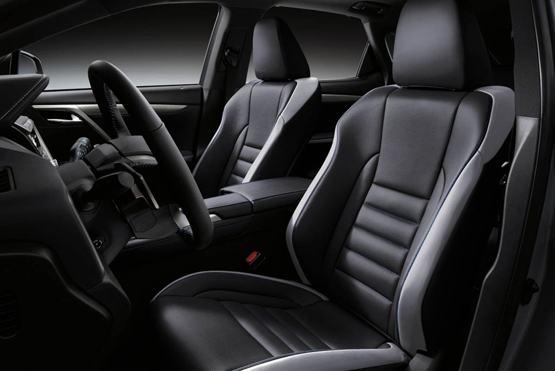 RX بلک لاین جدید در کابین از صندلیهای چرمی مشکی با عناصر سفیدرنگ و دوخت های متضاد آبی سود برده است. این خودرو همچنین به کفپوشهایی با حاشیه آبی و دستهکلید با دوخت آبی مجهز شده است.