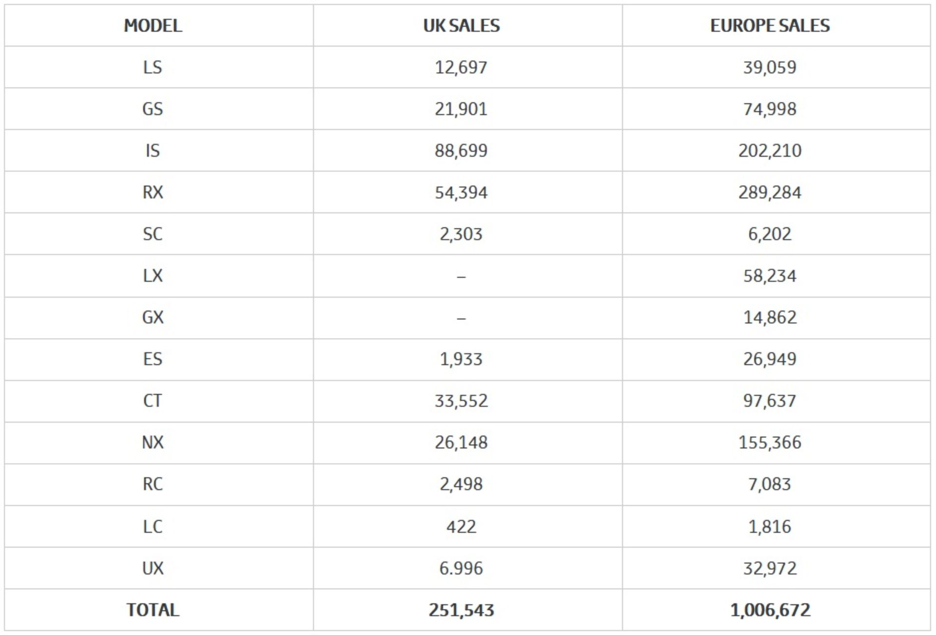 برند لوکس تویوتا همچنین تعداد 97637 دستگاه CT، تعداد 74998 دستگاه GS، تعداد 58234 دستگاه LX و 39059 دستگاه LS را در قاره همیشهسبز به فروش رسانده است. سوپرکار LFA که بین سالهای 2010 تا 2012 در کارخانه موتوماچی در ژاپن مونتاژ شده طی این مدت به خانه 38 اروپایی راه یافته است.