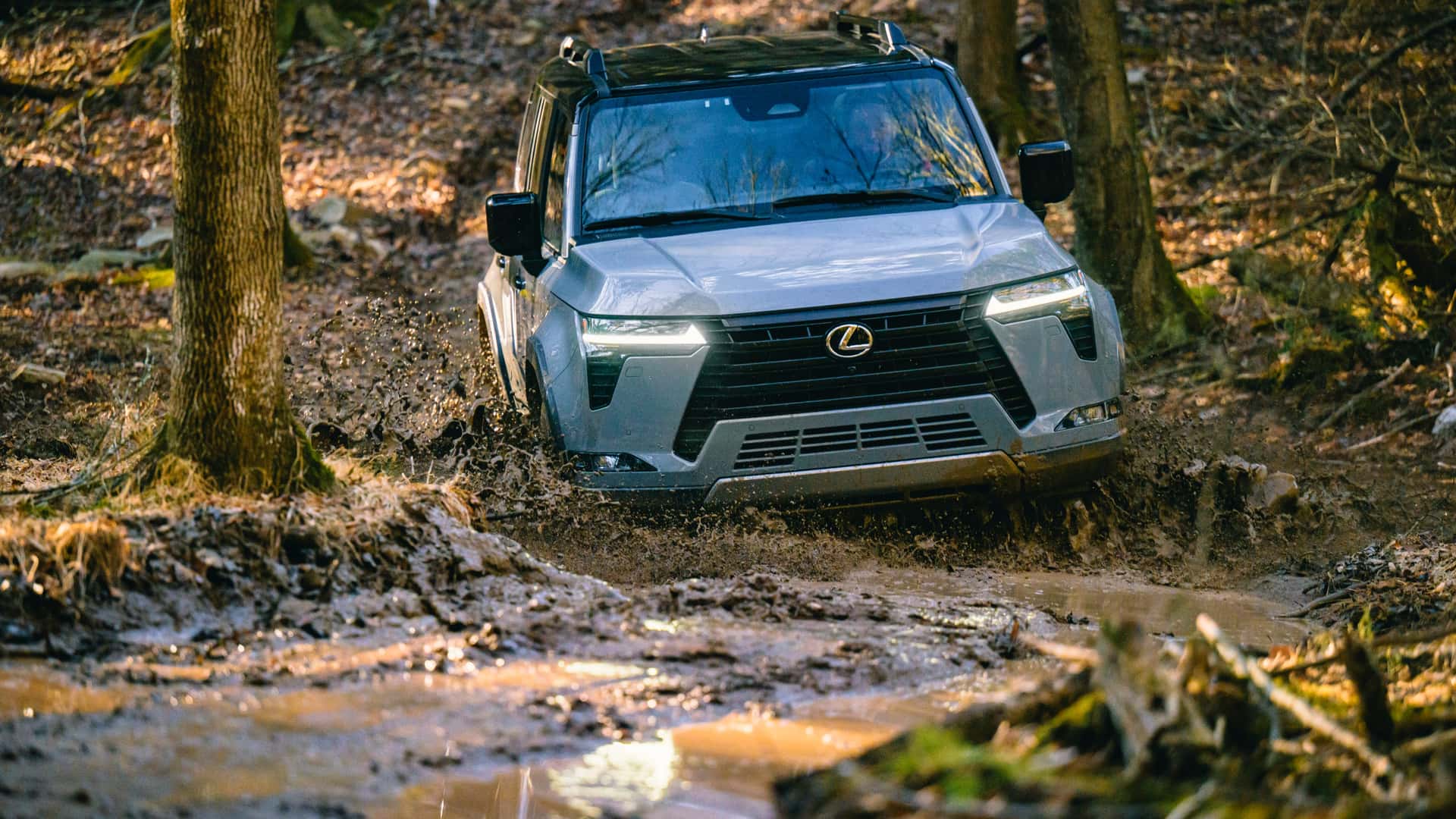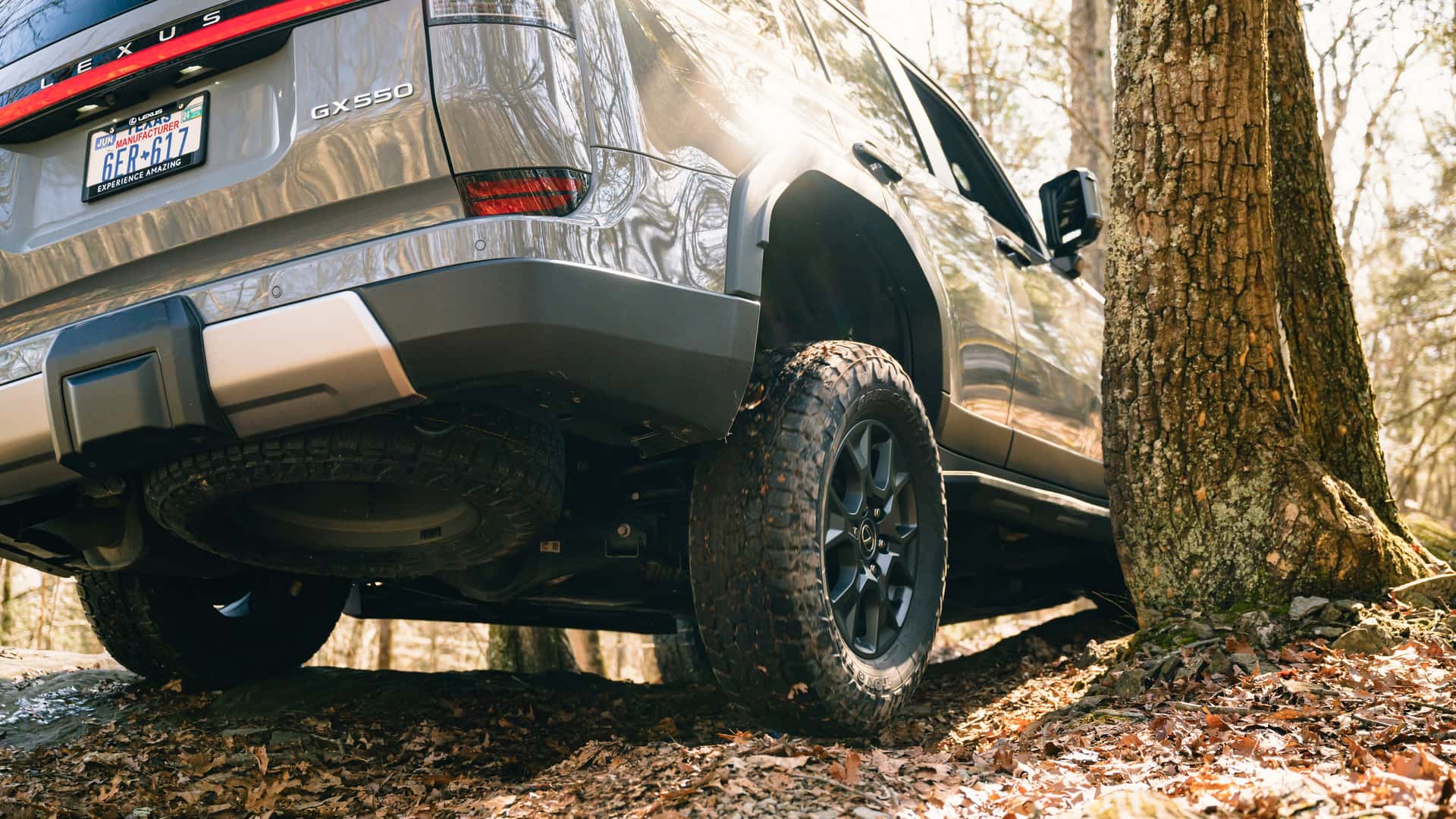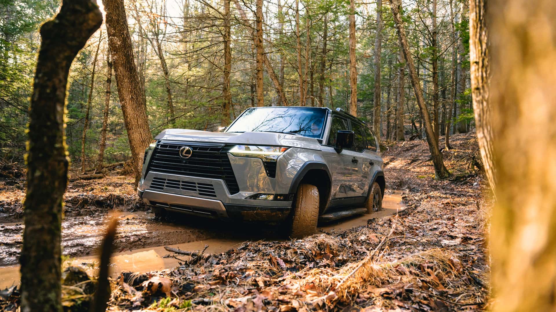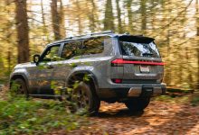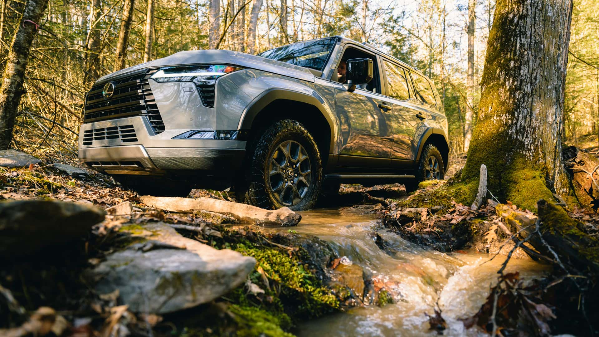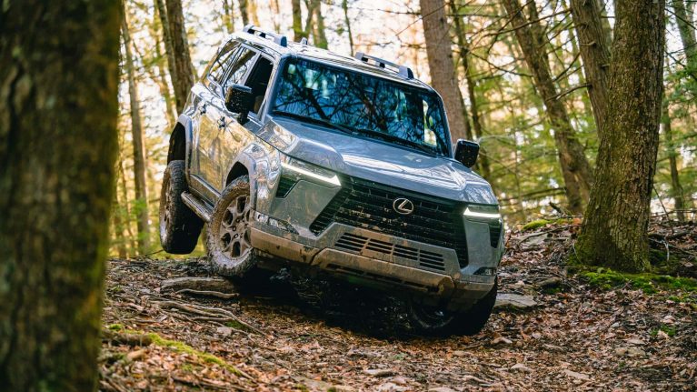 در مسیرهای جنگلی، قطعاً طول 5003 میلیمتری لکسوس GX جدید 2024 مسئلهساز است و گردش K در این منطقه نسبت به خودرویی همچون رانگلر دو در امری پیچیدهتر خواهد بود اما پهنای 2113 میلیمتری شاسیبلند لکسوس را میتوان بهتر مدیریت کرد. البته در نظر داشته باشید که زوایای تیز کاپوت در واقع گوشههای خودرو محسوب نمیشود و گلگیرها چند میلیمتری بیرونتر هستند.