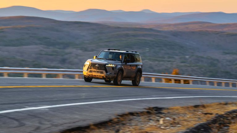 اما شاید بزرگترین ترفند این خودرو در مسیرهای جادهای بروز کند. با وجود چنین تواناییهای قابلتوجهی در آفرود، لکسوس GX جدید 2024 در روی آسفالت هم بسیار خوب عمل میکند. در سرعتهای پایین شاهد ورود لرزشهای جاده به کابین هستیم که از یک خودروی بدنه روی فریم انتظار میرود اما در دیگر موارد GX550 بسیار لوکس است. در حالتهای کامفورت و نرمال، دامپرهای تطبیقی سواری نرمی ارائه میکنند و گشتاور زیاد پیشرانه نیز باعث میشود پیشرانههای 8 سیلندر تویوتا را فراموش کنید.