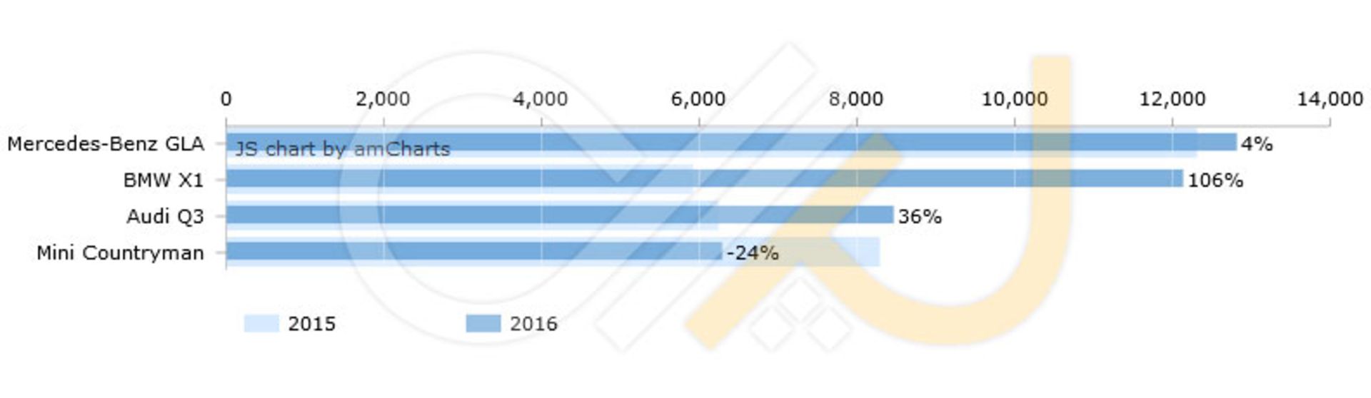 فروش خودروهای موجود در این کلاس در سه ماهه دوم امسال 15 درصد رشد داشته که اندکی سریع‌تر از رشد سه‌ماهه اول سال است. در کل در نیمه اول سال شاهد رشد 21 درصدی فروش شاسی بلندهای این کلاس هستیم. میزان رشد این سگمنت عموماً به علت موفقیت ب‌ام‌و X1 جدید است اما حتی مدل‌های قدیمی‌تر نیز عملکرد خوبی داشته‌اند مخصوصاً این امر درباره‌ی آئودی Q3 صادق است. در مجموع میزان رشد این کلاس در میان کلاس‌های مختلف شاسی بلندهای لوکس بیشترین است.