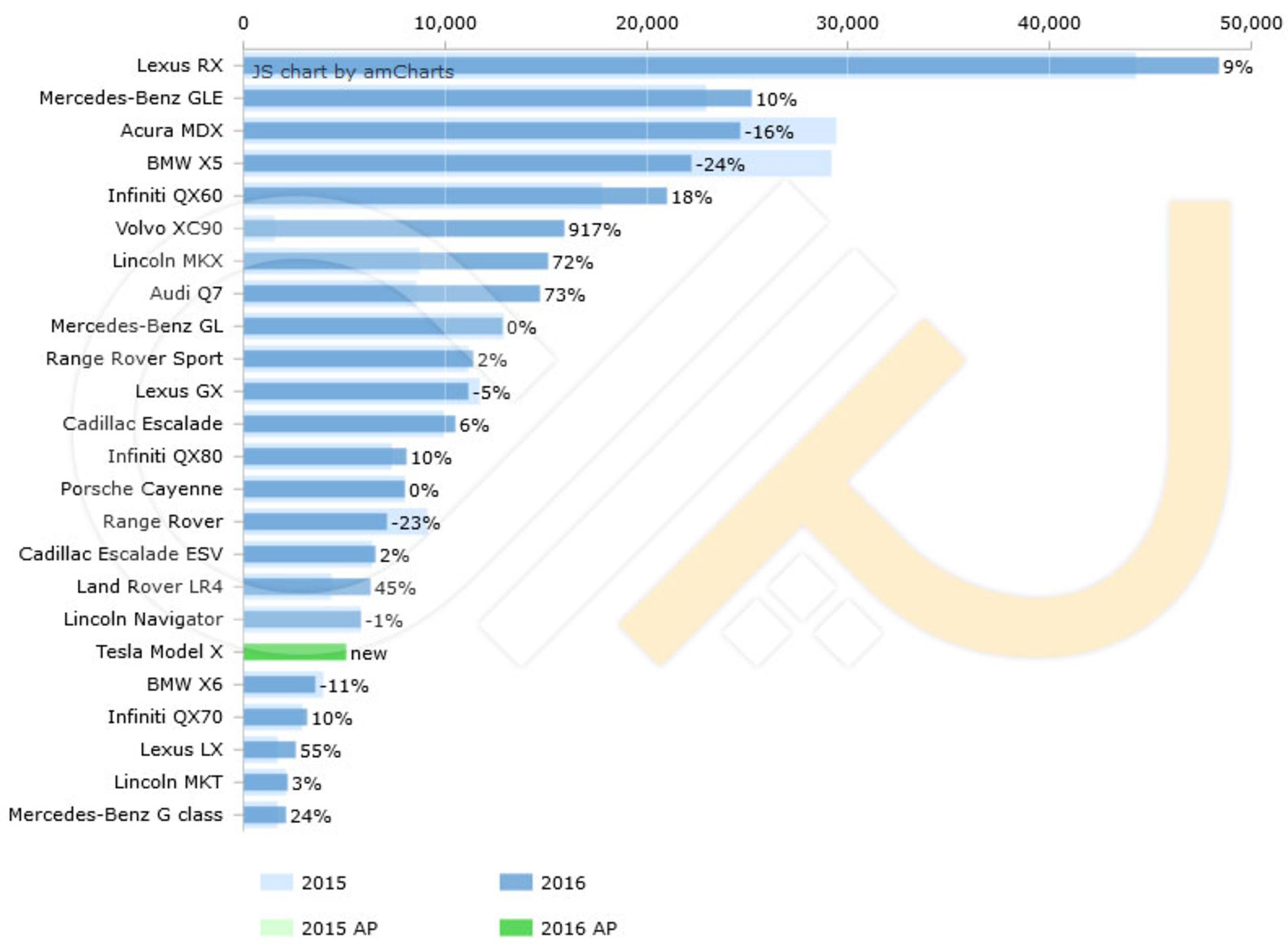 ولوو XC90 جدید، لینکلن MKX و آئودی Q7 همگی رشد فروش چشمگیری داشته و بسیاری از مدل‌های قدیمی‌تر را در جدول رده‌بندی پشت سر گذاشته‌اند.