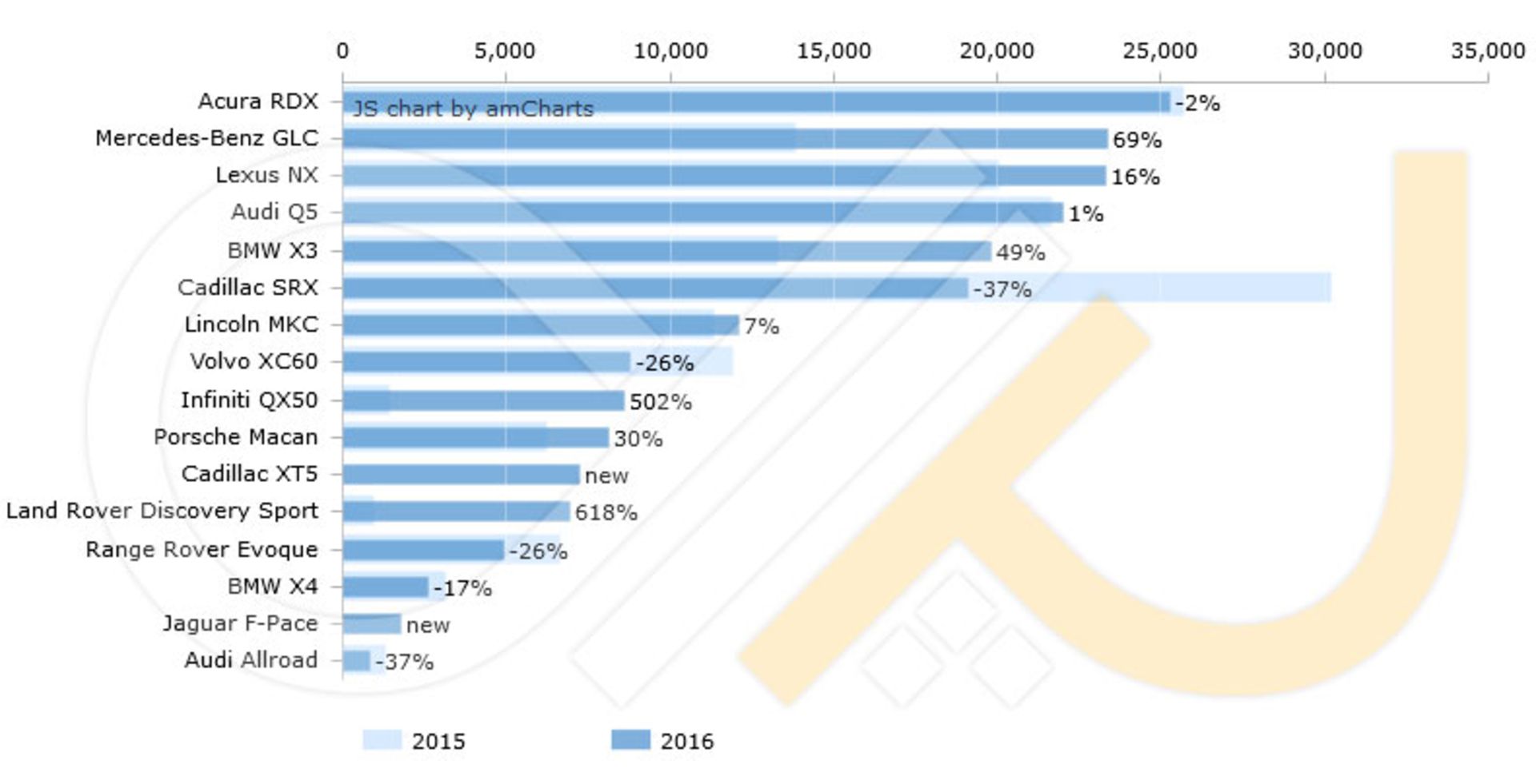 آکورا MDX و ب‌ام‌و X5 با افت فروش مواجه بوده‌اند و مرسدس بنز GLE این دو را پشت سر گذاشته است.