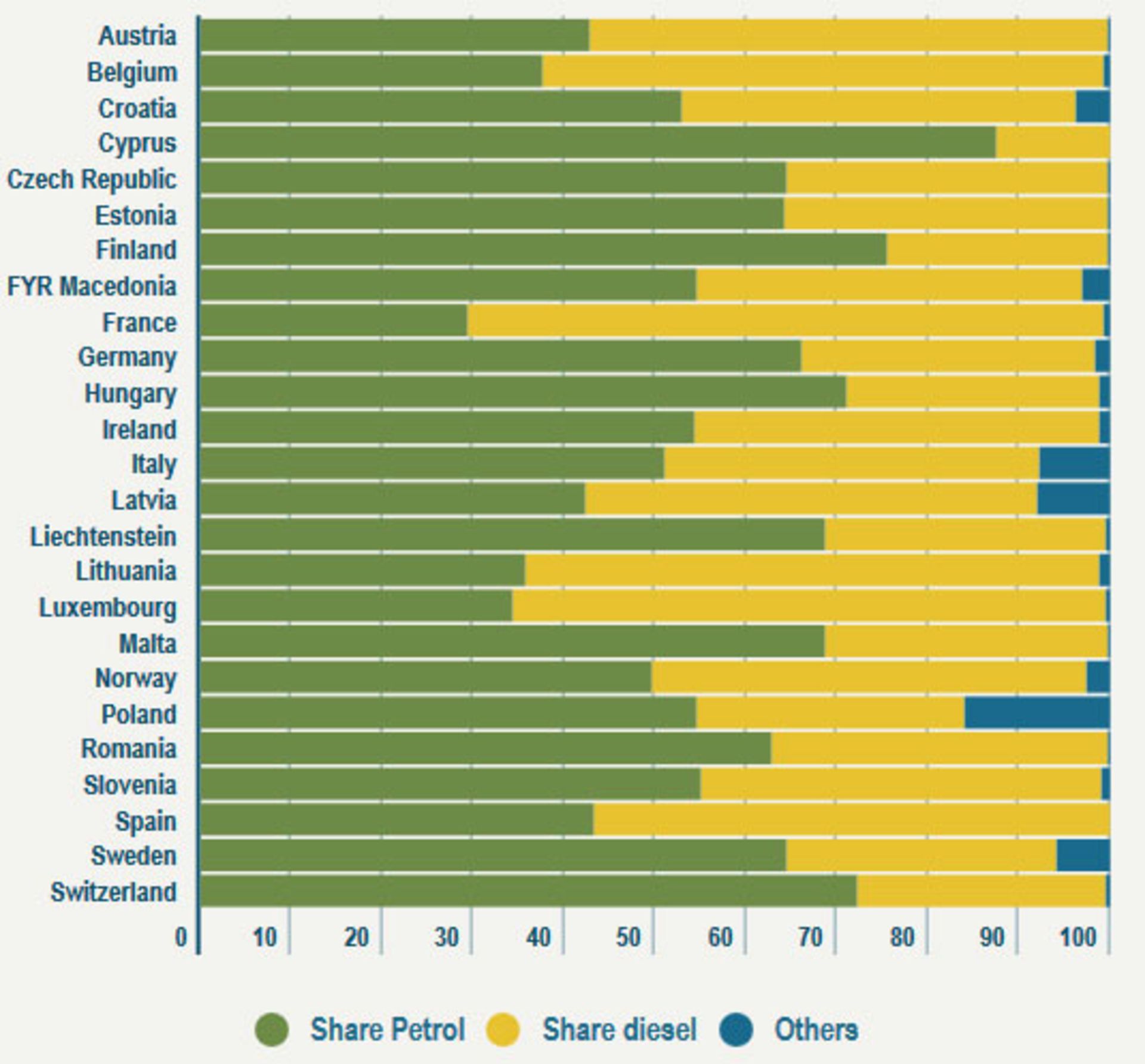 البته از سال 2008 تاکنون تقاضا برای خودروهای دیزلی و بنزینی بهطور چشمگیری کاهش یافته است. در حقیقت فروش دیزلیها از 8.2 میلیون دستگاه سال 2008 به 4913025 دستگاه در سال 2014 رسیده است. بهطور مشابه فروش خودروهای بنزینی نیز در این سال تنها 3915268 دستگاه بوده که کمترین میزان فروش محصولات بنزینی اروپا در بیش از 30 سال گذشته بوده است. این اعداد و ارقام به دوره پیش از رسوایی دیزل گیت مربوط هستند.
