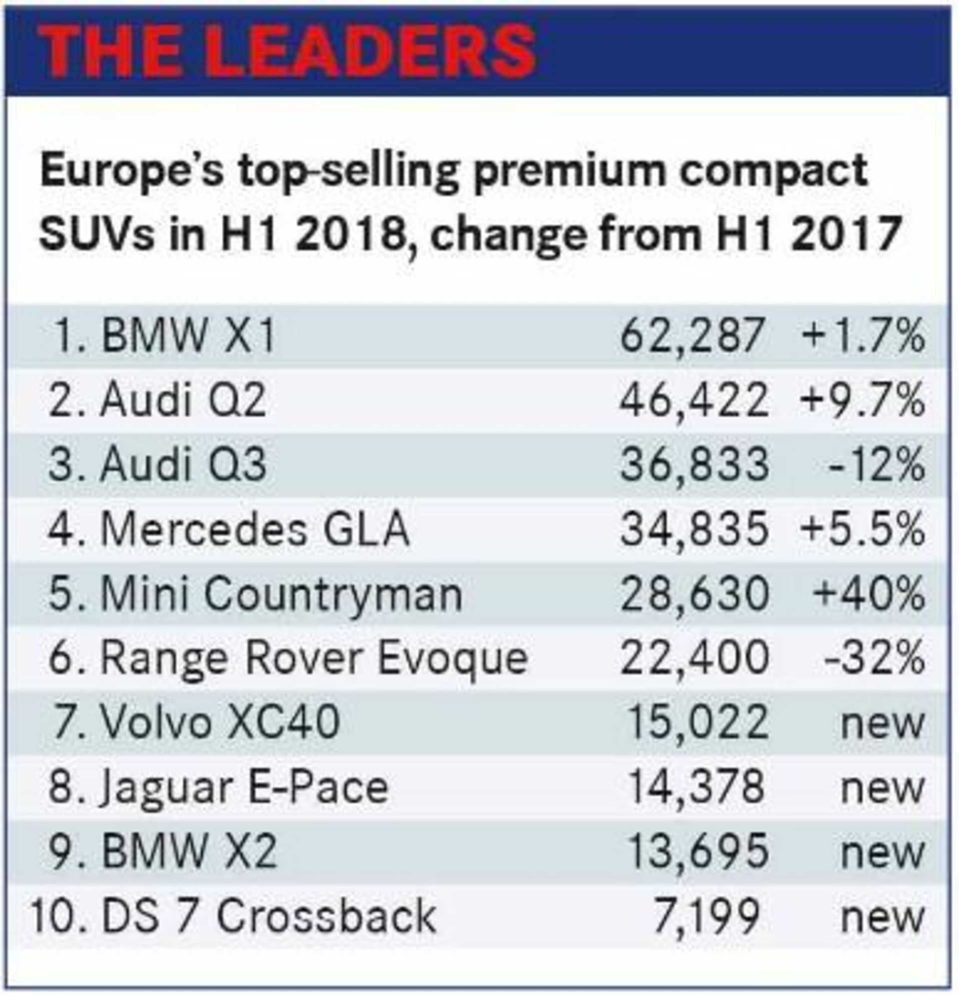آمار و ارقام همچنین نشان میدهند آئودی هم در نیمه اول سال جاری کاملاً خوب عمل کرده و Q2 فروش 46422 دستگاهی را ثبت کرده است. مدل Q3 هم به خانهی 36833 نفر راه یافته است. رتبههای چهارم، پنجم و ششم فروش این کلاس به ترتیب به مرسدس GLA (فروش 34835 دستگاهی)، مینی کانتری من (فروش 28630 دستگاهی) و رنجروور اووک (فروش 22400 دستگاهی) رسیده است. چهار رتبه بعدی هم به ترتیب به خودروهای یاد شدهی XC40، جگوار E پیس، X2 و DS7 تعلق دارد.