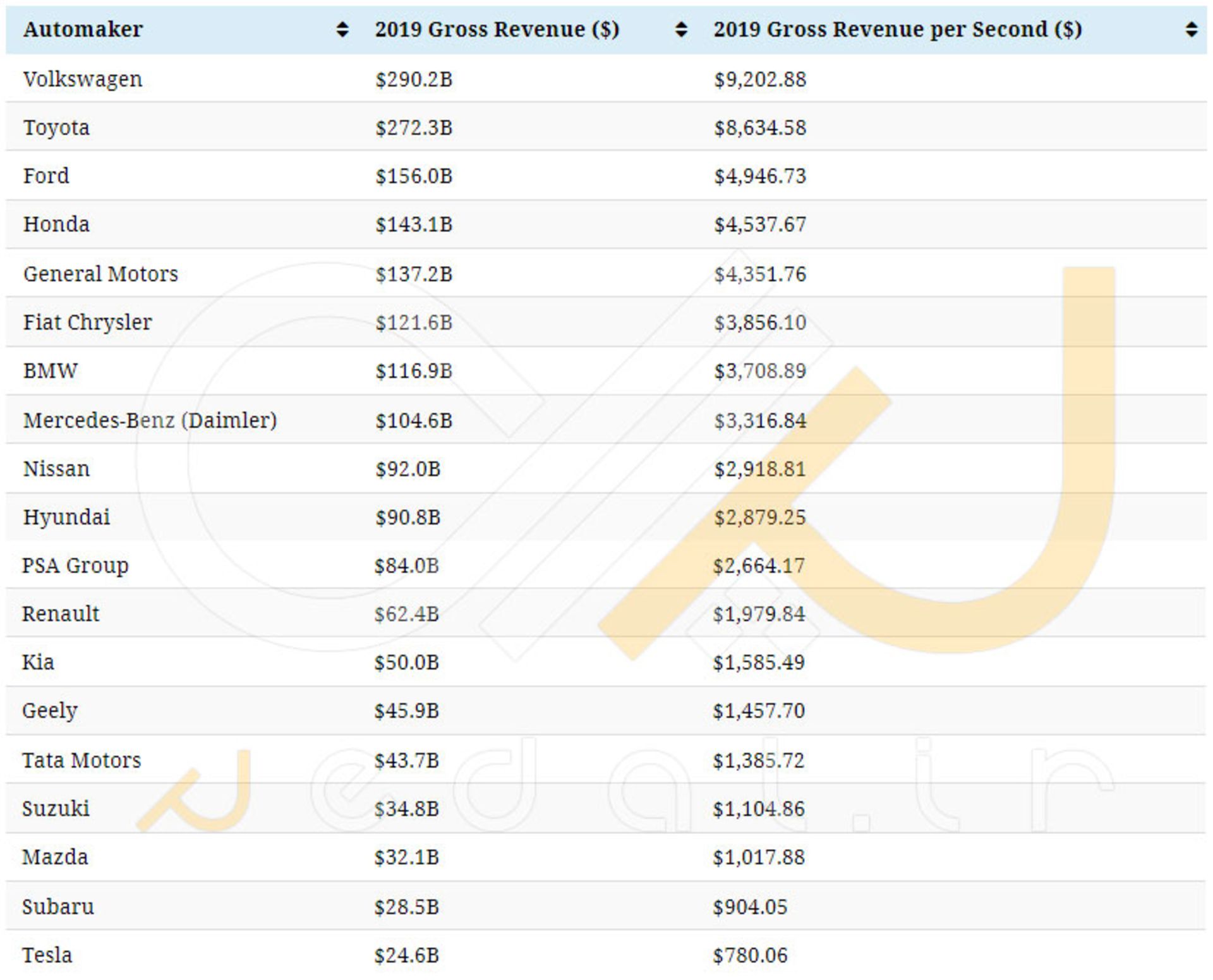 اما در انتهای لیست شرکتهایی همچون تسلا و سوبارو دیده میشوند که درآمد آنها زیر 1000 دلار و به ترتیب برابر با 780.06 و 904.05 دلار در هر ثانیه بوده است. مزدا نیز با درآمد 1017.88 دلاری در هر ثانیه درست بالای سر سوبارو بوده و سوزوکی نیز درآمد 1104.86 دلاری داشته است. این برندها میزان تولید برابری با دیگر خودروسازان بزرگ نداشته و به همین خاطر از تولید، فروش و درآمد محدودتری برخوردار هستند.