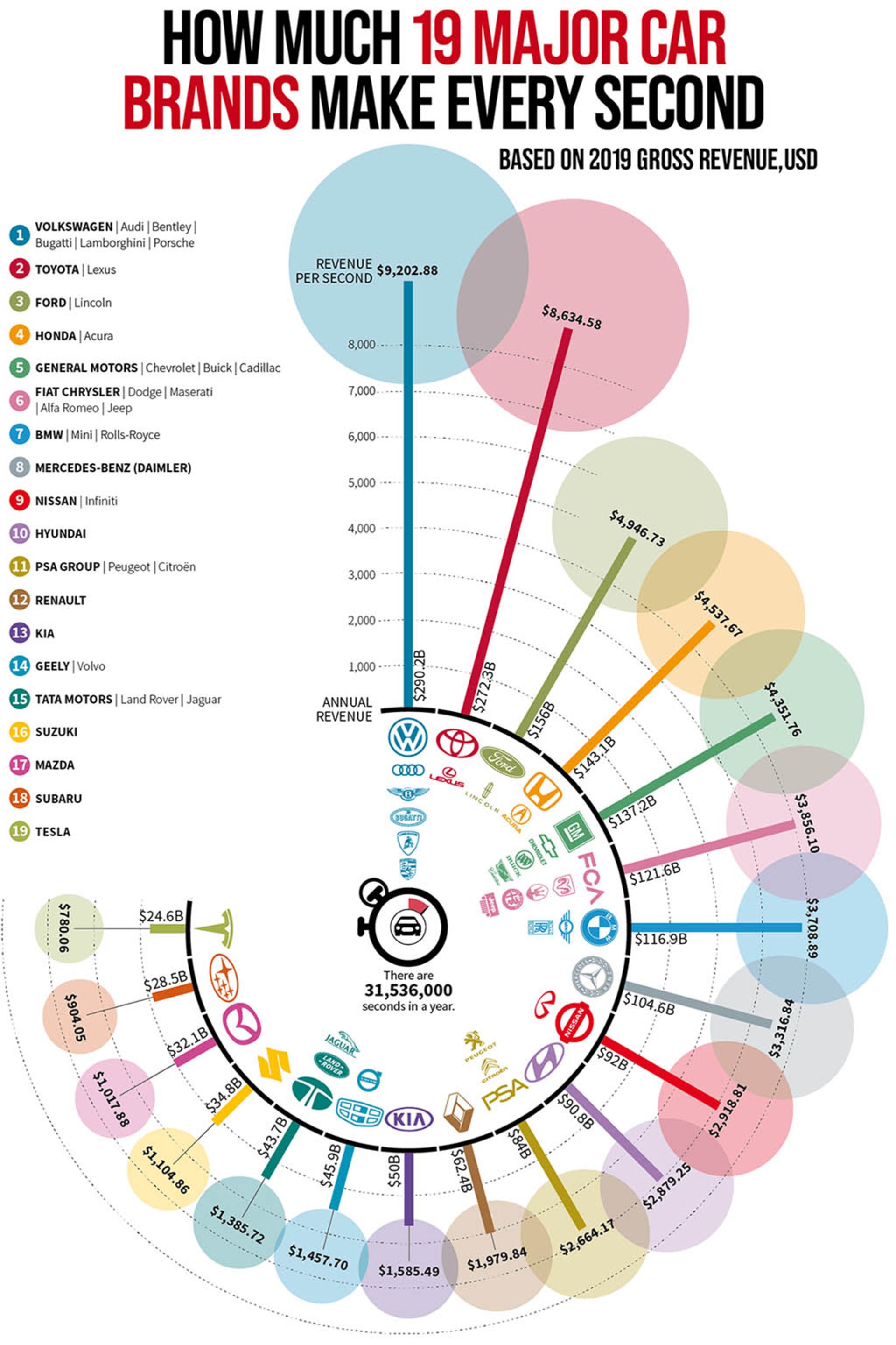 این مطالعه به درآمد ناخالص 19 خودروساز که 92 میلیون دستگاه خودرو در جهان تولید کردهاند پرداخته است. دو خودروساز اصلی این مطالعه گروه فولکسواگن و تویوتا هستند که سال پیش در هر ثانیه به ترتیب 9202.88 و 8946.58 دلار درآمد داشتهاند. این مبلغ زیادی بوده و با خودروساز سوم لیست یعنی فورد فاصله قابلتوجهی دارد. فورد سال پیش در هر ثانیه 4946.58 دلار درآمد داشته است.