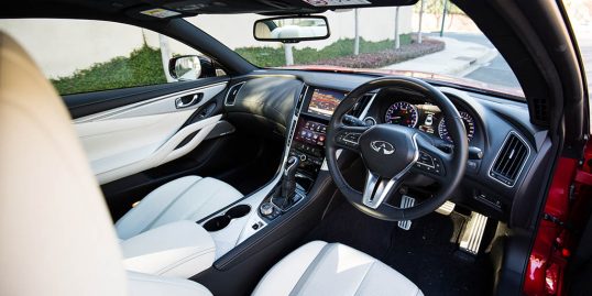 این رنگ قرمز، شاخصترین رنگ از بین 9 رنگ دیگس که خریداران میتونن واسه ماشینشون انتخابش کنن، رینگهای 19 اینچی و چراغهای LED تطبیقپذیر هم داره. سه تا تریم داخلی مختلف به همراه سه نوع تزیین مختلف متالیک یا فیبرکربنی زینتبخش کابین Q60 هستن. هر سه ماشین از فناوری high beam(نوربالای خودکار)، صندلیهای جلو گرم شونده، روکش چرمی صندلیها، سیستم اطلاعات سرگرمی پیشرفته، دوربین 360 درجه و کروز کنترل تطبیقپذیر بهرهمند هستن. آئودی و BMW صفحه کیلومتر شمار دیجیتال دارن اما من توی اینفینیتی مجبورم با یه دونه آنالوگش سر کنم، اما عوضش دوتا صفحه نمایشگر دارم.