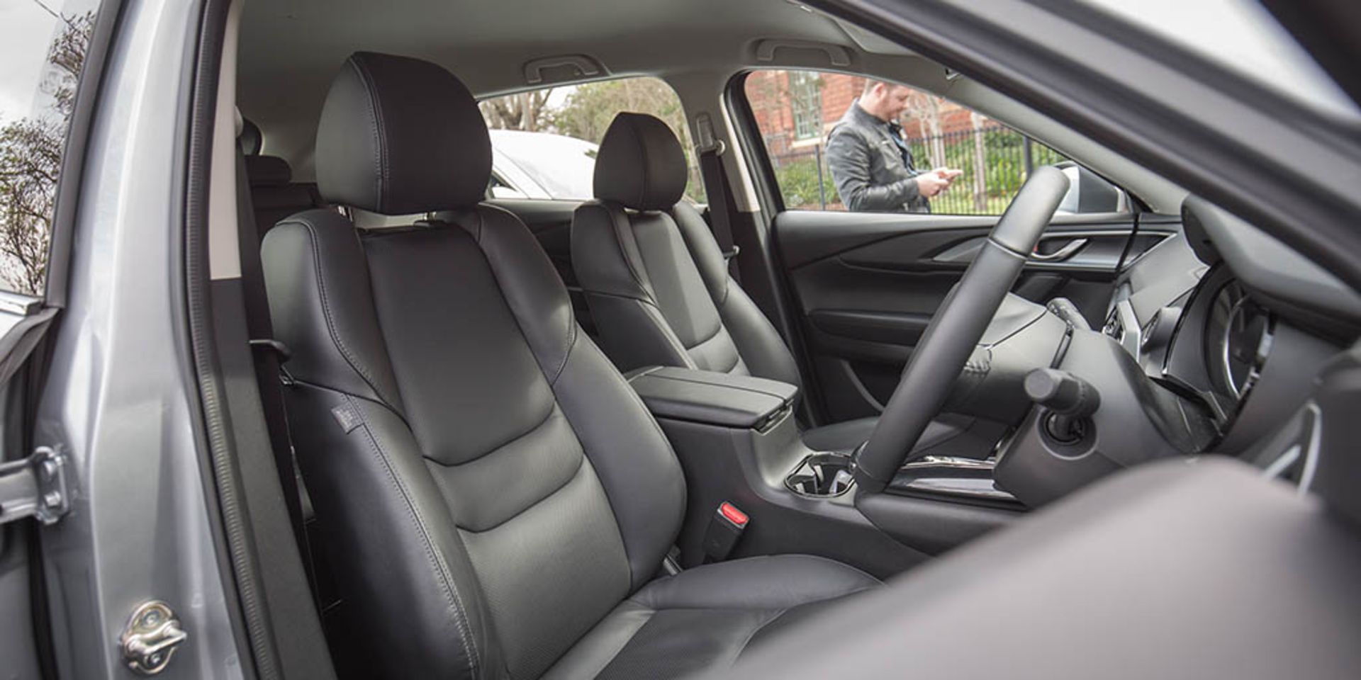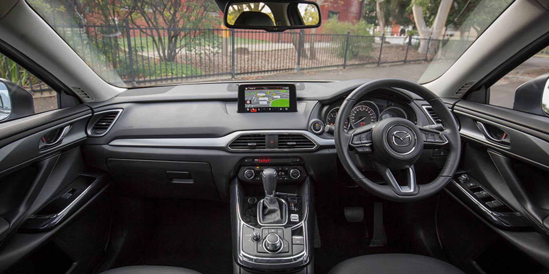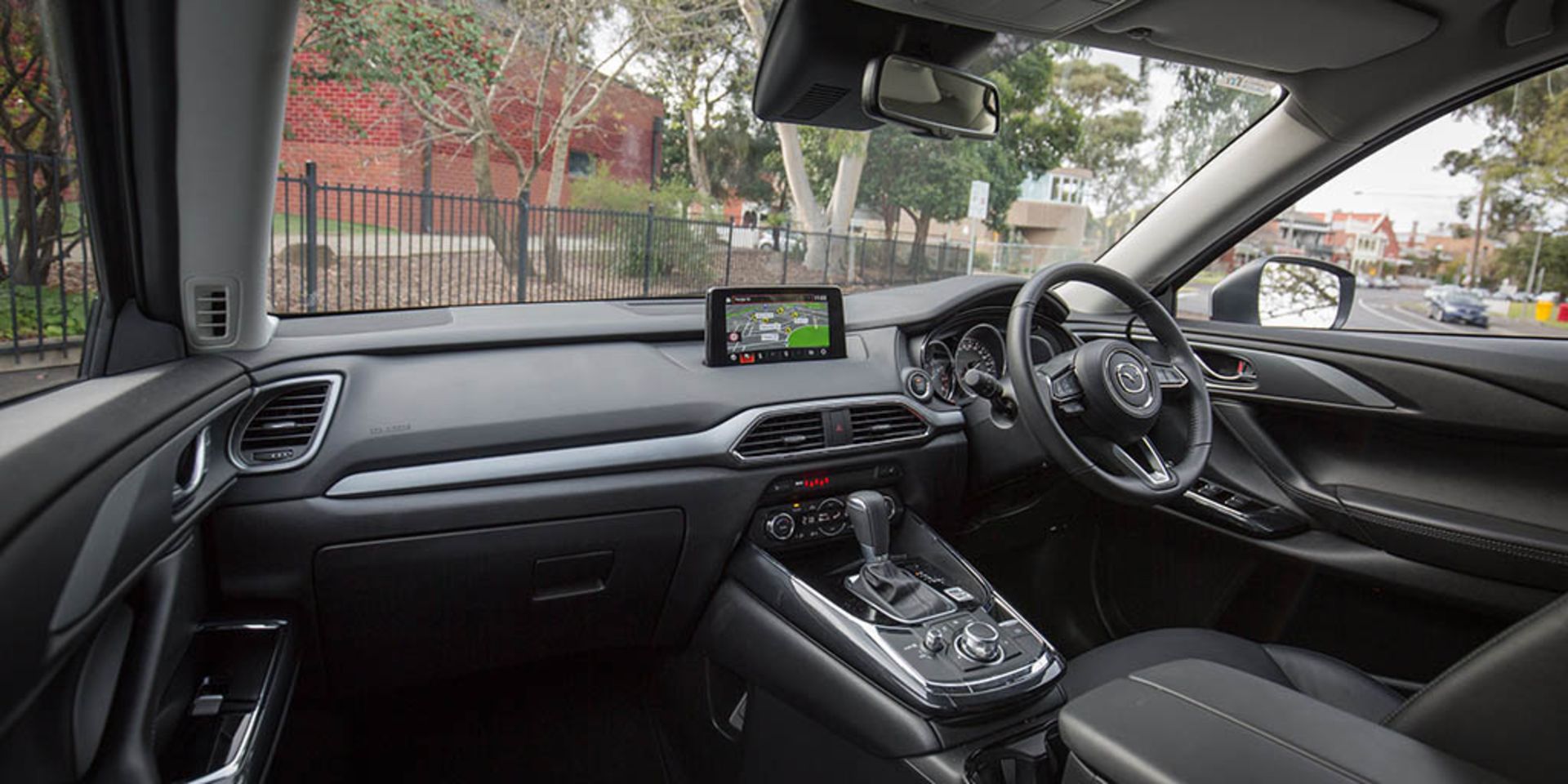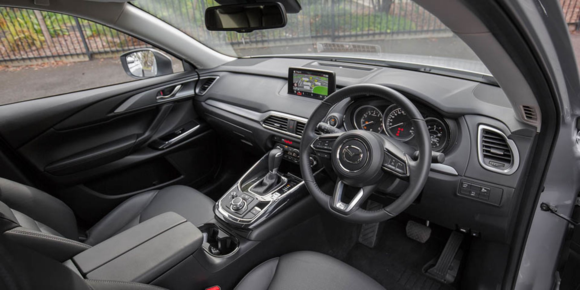 کنسول عظیم در وسط و تکیه‌گاه دست نسبتاً بزرگ روی درب‌ها، احساس شکوه و جلال را به روحتان منعکس می‌نماید. همچنین صندلی‌ها برقی بوده و از حالت گرم شوندگی نیز برخوردارند. فضای کافی، پنل درب‌های شکیل و درب داشبورد باکیفیت نیز جزو نقاط قوت کابین CX-9 قلمداد می‌شوند. فقدان سرعت‌سنج دیجیتال و نورپردازی ضعیف‌تر کابین مزدا نسبت به اشکودا را نیز می‌توان جزو لیست بدها بر روی تخته سیاه کلاس CX-9 یادداشت نمود.
