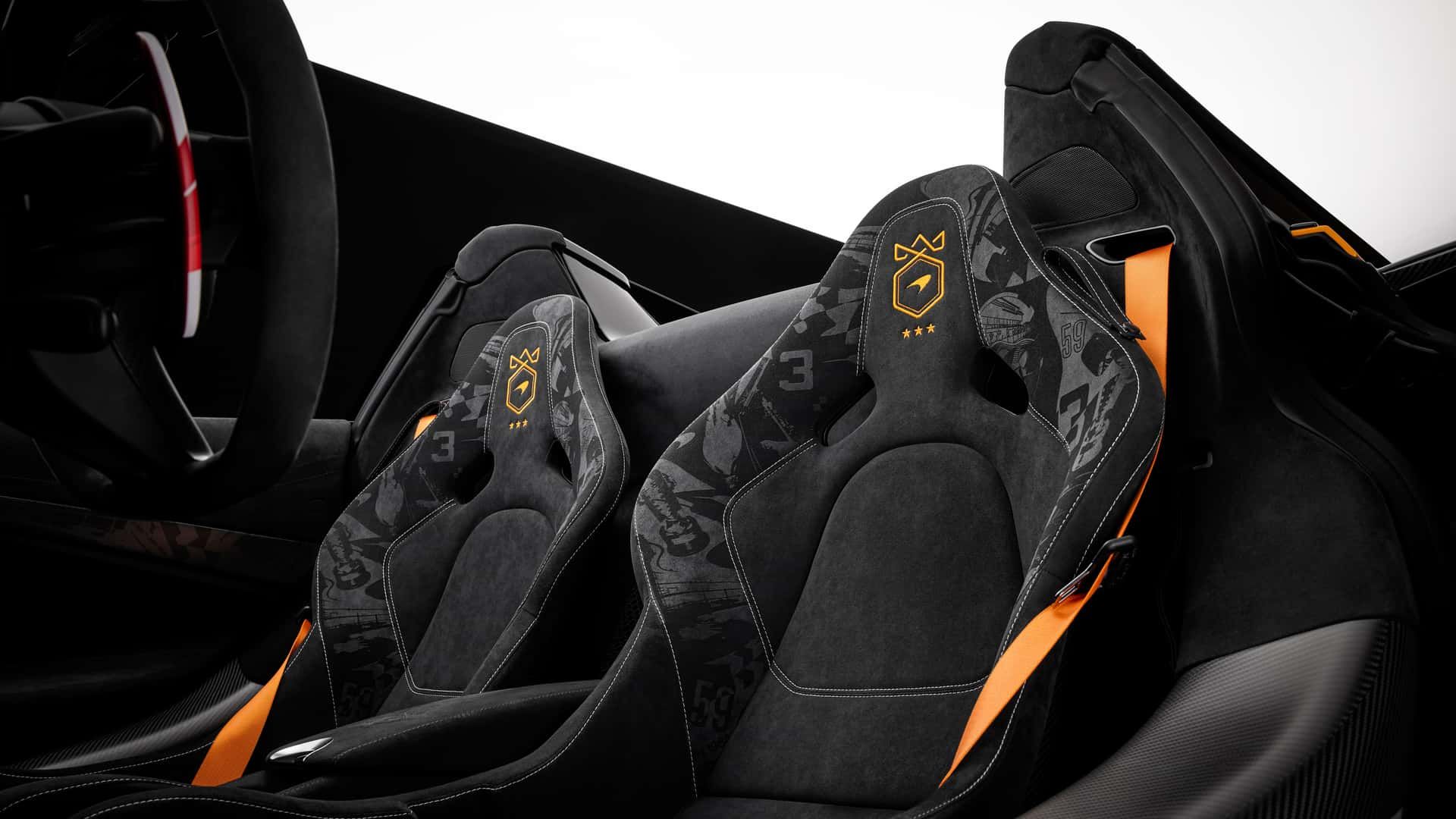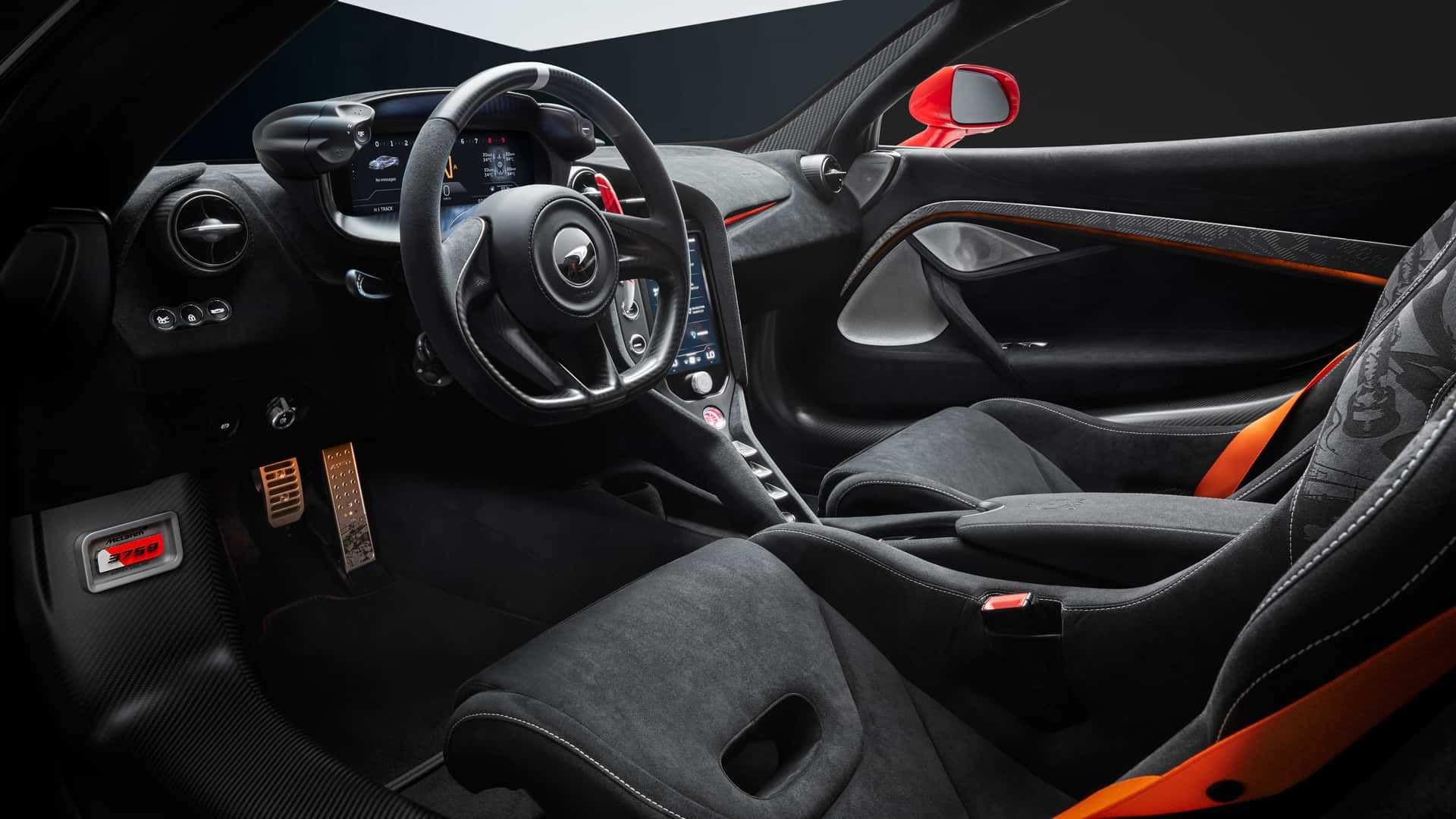 زمانی که وارد کابین شوید لوگوی تاج سه گانه با دوخت نارنجی را روی صندلیهای کربنی خواهید دید. همین نشان در استراحت گاه دست مرکزی نیز وجود دارد. ردپای پوشش متمایز بدنه را میتوان روی صندلیها نیز دید. MSO همچنین از تریم ویژهای روی فرمان و پدال شیفترها استفاده کرده و الگوی قرمز و سفید خودروی فرمول یک این شرکت در پدالها دیده میشود. نکته جذاب دیگر درباره 750S پلاک تزئینی روی درب خودروست که از بدنه فیبر کربنی همان خودروی فرمول یک پیروز گرندپری 1984 ساخته میشود. بدنه این خودرو با دست رنگآمیزی شده و متریال بکار رفته در آن قیمت بالایی دارند و به بهای پایه 330 هزار دلاری مک لارن 750S افزوده میشوند. در حقیقت یکی از مسئولان این برند قیمت خودرو را حدود 700 هزار دلار اعلام کرده است. شایان ذکر است تنها 6 دستگاه از 750S طرح 3-7-59 تولید خواهد شد و تمامی آنها قبلاً به فروش رسیدهاند.