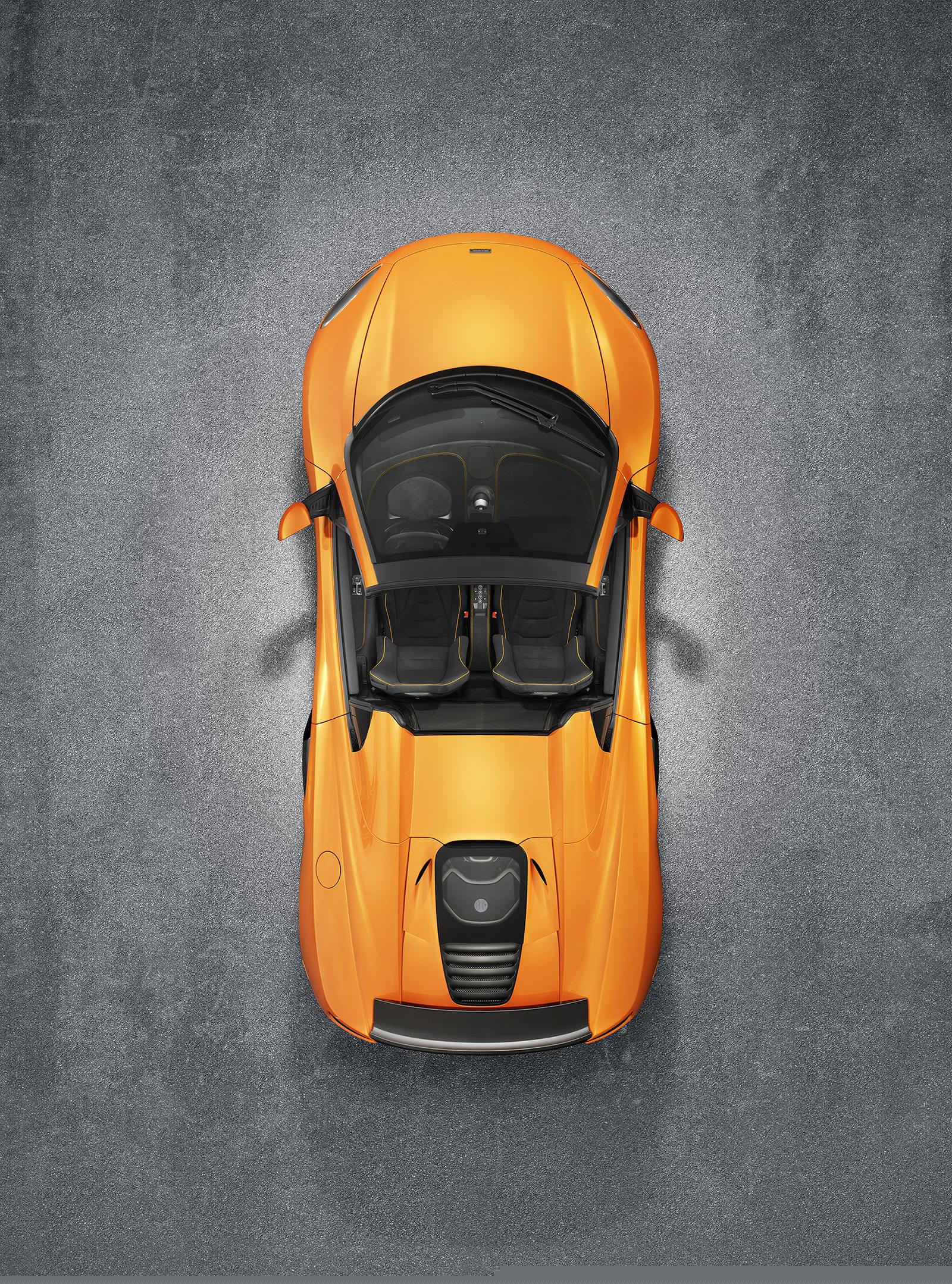امروز نسخه اسپایدر با رنگ زیبای نارنجی Tarocco برروی صحنه آمد تا یکی دیگر از خودروهای خبرساز ژنو لقب بگیرد . این رنگ آمیزی زیبا برای محصولات جدید مک لارن به لطف همکاری با شرکت AkzoNobel حاصل شده است . مدل اسپایدر برروی شاسی تک سلولی مک لارن بدون هیچ گونه تغییری سوار شده است . اگرچه نسبت به نسخه کوپه یک سقف کمتر دارد اما تفاوت وزنی زیادی بین این دو مدل نیست و تنها با 40 کیلوگرم وزن بیشتر ، عملکردی مشابه از لحاظ هندلینگ ارائه خواهد داد .