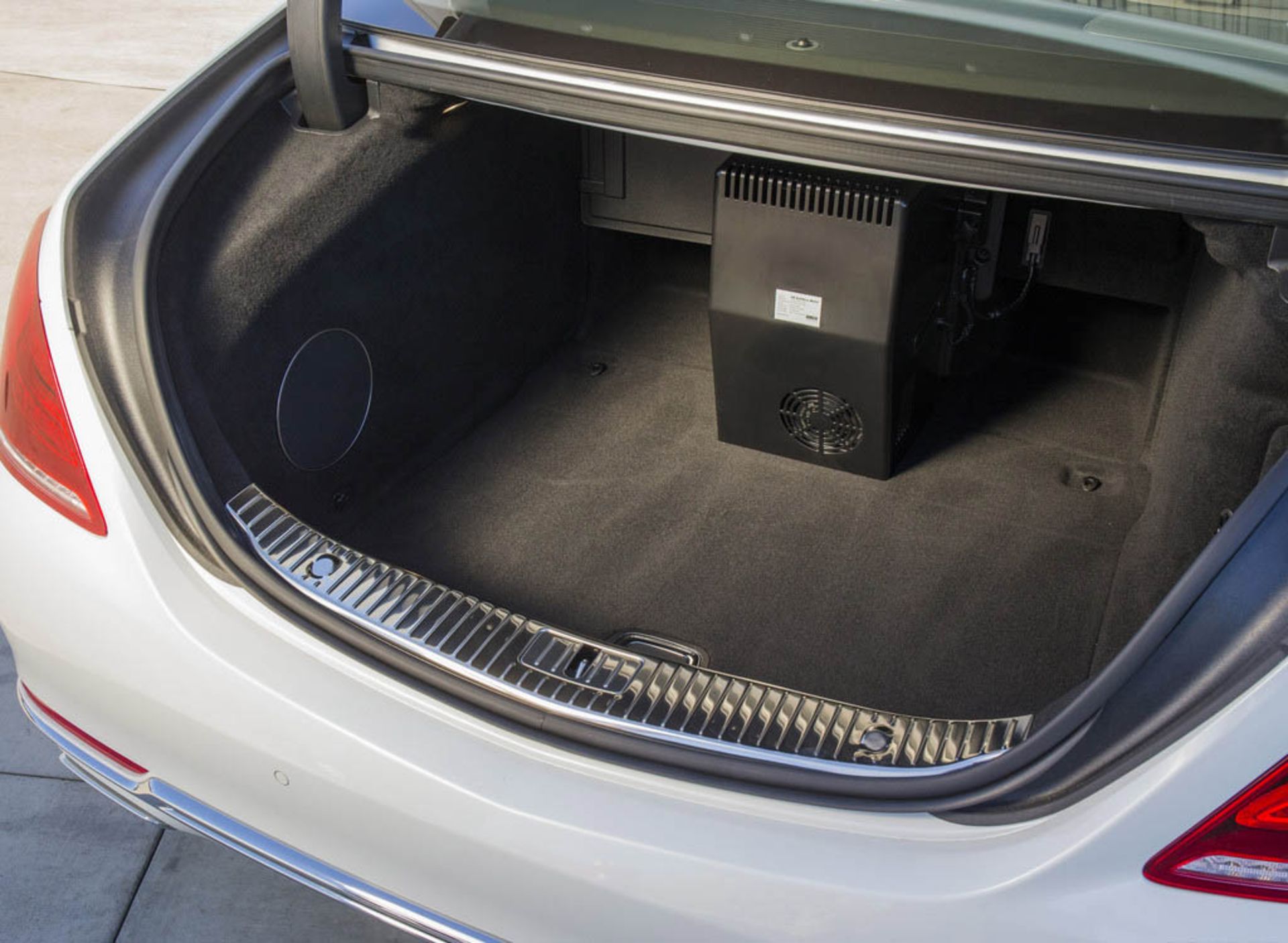 درون کنسولِ بین صندلی‌های عقب میز تاشوی آلیاژی جاسازی‌شده که برای صرف غذا یا استفاده از لپ‌تاپ و تبلت خود می‌توانید از آن استفاده کنید. محل مخصوص قرار دادن نوشیدنی هم تقریباً همان‌جاست. کمی عقب‌تر هم یک یخچال کوچک قرار داده‌شده تا نوشیدنی‌های موردعلاقه‌تان را خنک بنوشید!
