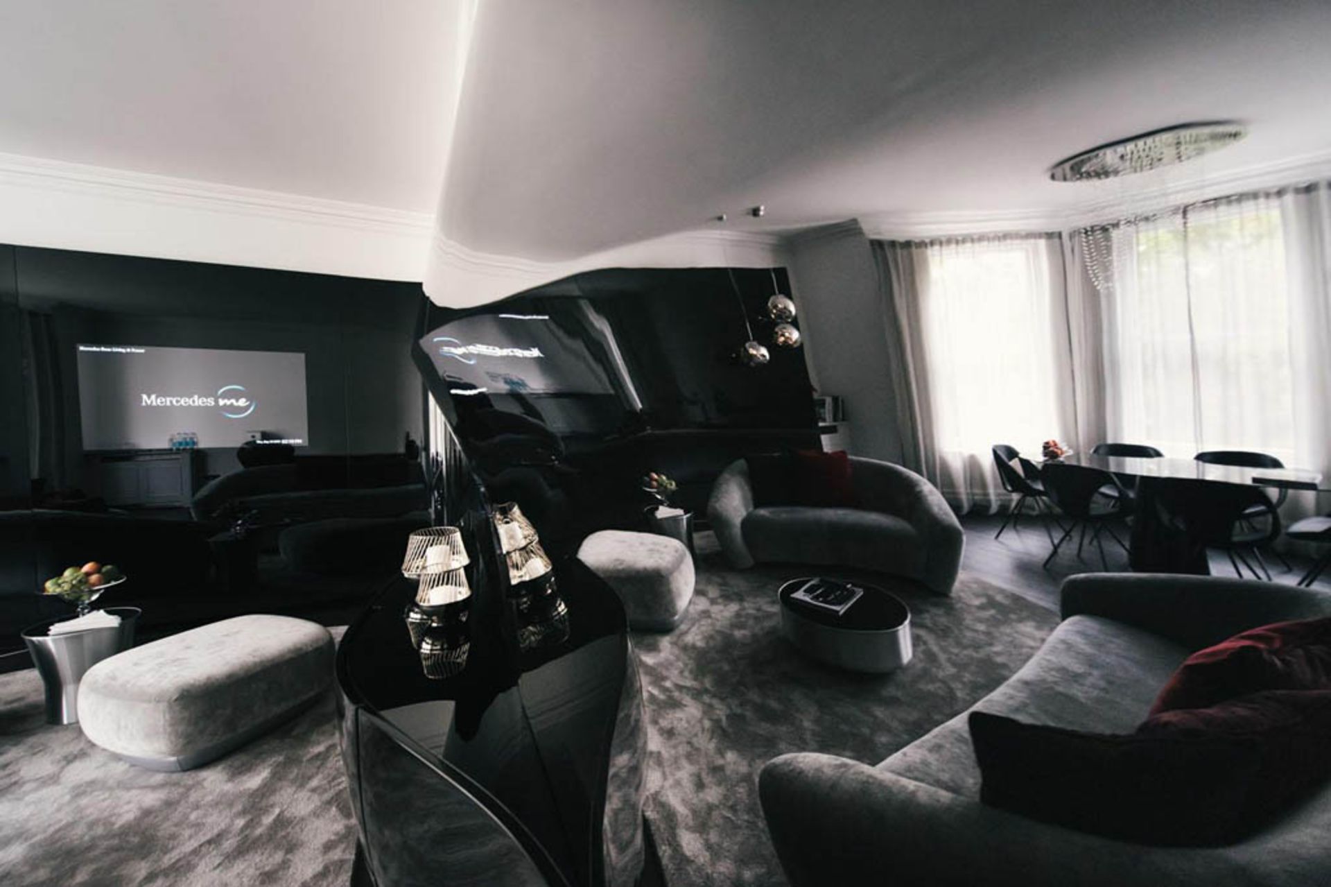 تمام عناصر دکوراسیون، مشخصههایی از طراحی مرسدس را در خود دارند. قطعات مفهومی با کمانهای افراطی خود با خطوطی جاری در پیکره مبلمان همراه میشوند و به شکلی نامحسوس، به صورت یک کالبد ارگانیک در میآیند. در عین حال، تکنولوژیهای خلاقانه سرگرمی و رسانهای، تجربهای چند جانبه در اختیار قرار میدهند. طراحان مرسدسبنز به خوبی از عهده ایجاد تزئینات و فضای حاکم بر یک خودروی مرسدس در یک آپارتمان خدماتی لوکس برآمدهاند. هدف آنها ایجاد حسّ خاص مرسدسبنز برای مهمانان بوده است.