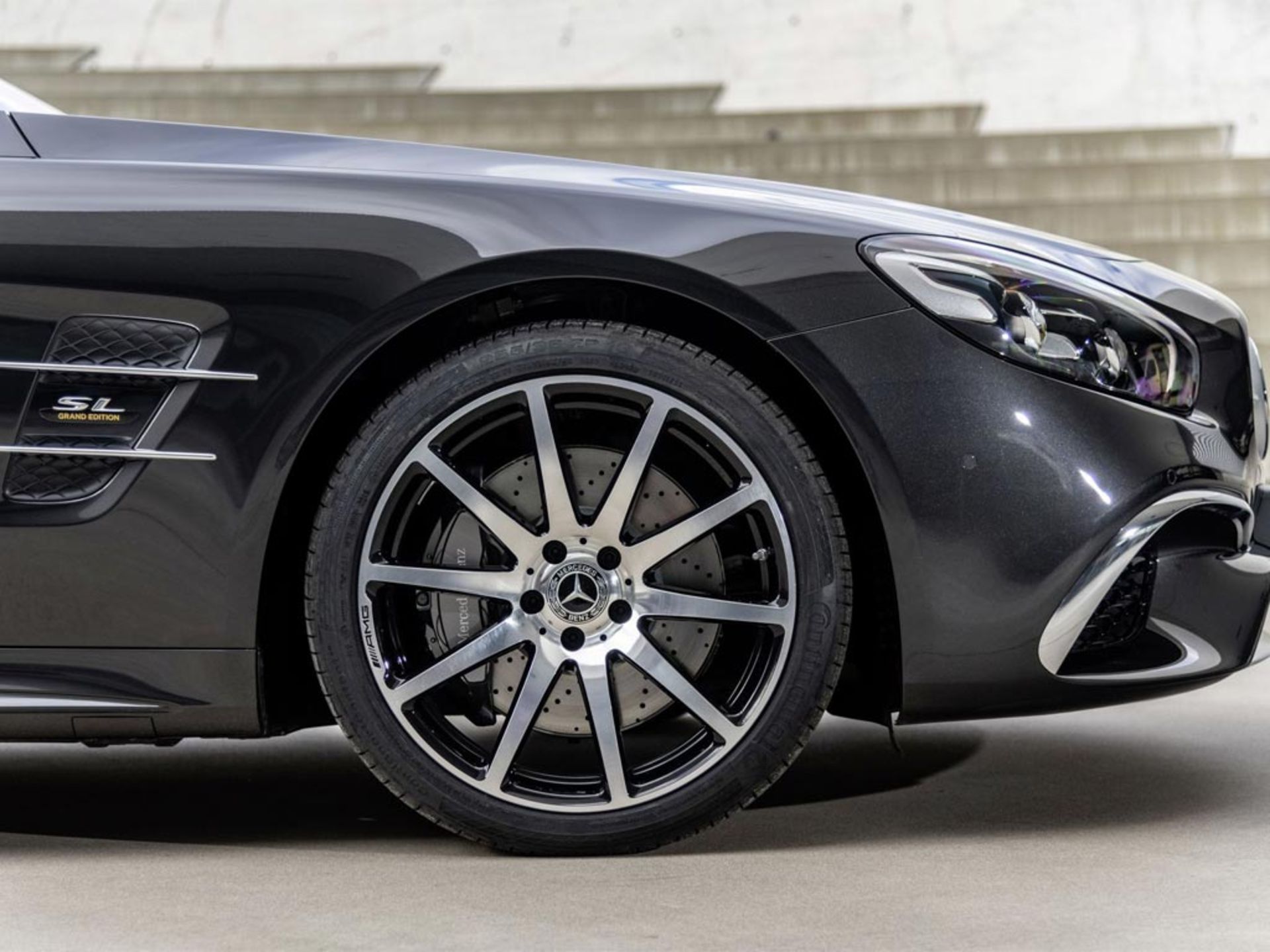 صرفنظر از رنگ بیرونی، تمامی مدلهای این نسخهٔ ویژه در سپر جلو از تریم کرومی براق و نقرهای مات برخوردار هستند. SL گرند ادیشن همچنین به رینگهای 10 پرهٔ فورجکاری شدهٔ دورنگ مشکی و نقرهای AMG هم مجهز شدهاند که در جلو 19 اینچی و در عقب 20 اینچی هستند. یکی دیگر از ویژگیهای بیرونی این نسخهٔ ویژه نیز نشان SL Grand Edition روی گلگیرهای جلوی آن است. این نسخهٔ به سیستم تعلیق اسپرت جدیدی هم مجهز شده که ارتفاع خودرو را یک سانتیمتر کاهش داده است.