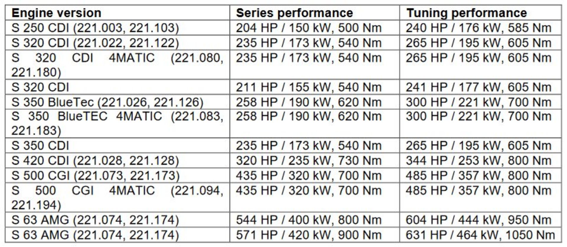 این تیونر با دریافت 1084 یورو در آلمان باعث قویتر شدن مدلهای S250 CDI، S320 CDI، S350 بلوتک، S350 CDI، S420 CDI و S500 CGI میشود.