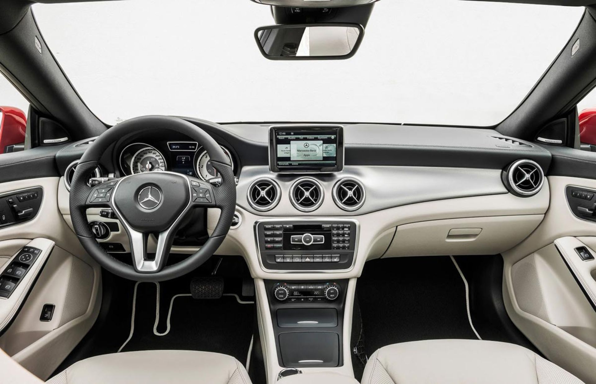 داخل کابین، پر از ابزارهای هیجانانگیز است. داشبورد CLA، کاملاً رنگ و بوی یک مرسدسبنز واقعی را دارد. فارغ از طراحی ناخوشایند پلاستیک بین صندلیها، صفحه نمایش ۵/۸ اینچی با وضوح مناسب، از تجهیزات استاندارد CLA250 است که در جلوی دید راننده قرار گرفته است. صندلیهای اسپورت، بسیار راحت به نظر میرسند و بالاترین کیفیت مرسدسبنز در آنها به کار رفته است. در مجموع، کابین جای راحتی است و ما را یاد سدان کامپکتهای نسل قبل میاندازد.