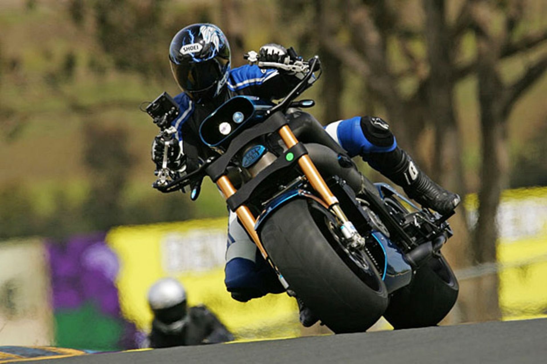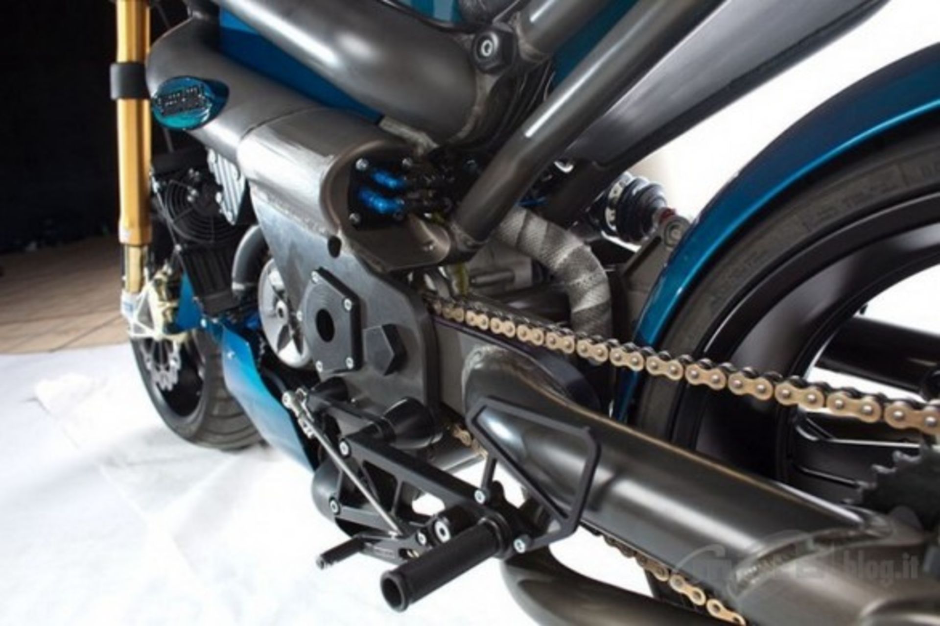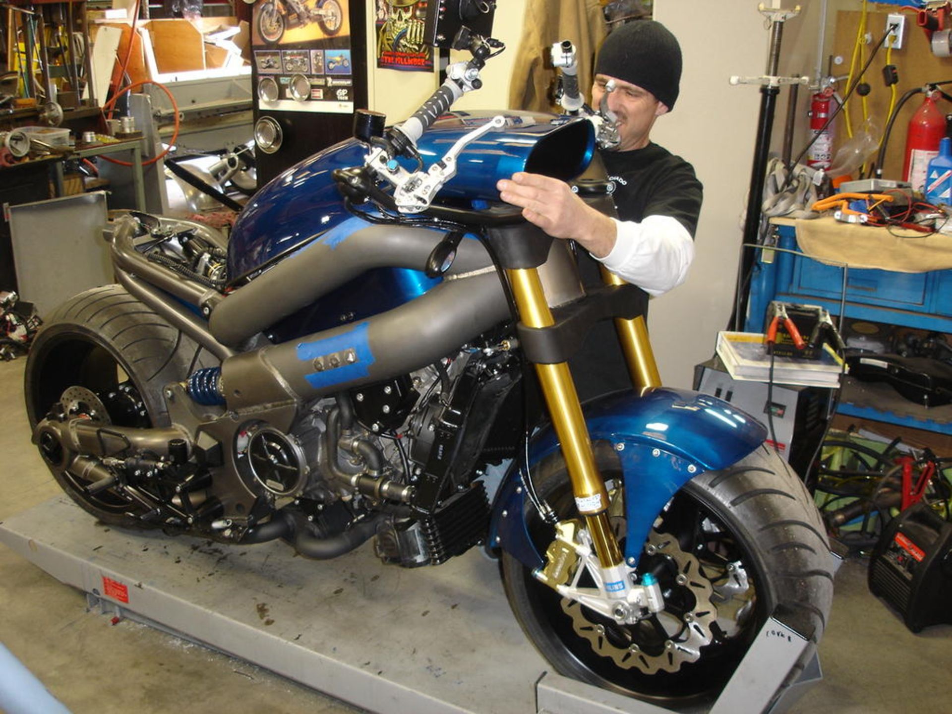 تایرهای جلو با اندازه 250 و در عقب با اندازه 300 در 35/18 به نظر کنترل سختی را برای سوارکار به همراه داشته باشند. شاسی این موتورسیکلت از تیوبی به قطر 5 اینچی یا 12.7 سانتیمتر شکل گرفته است که چهره ای پهنپیکر و عضلانی به آن بخشیده است. قسمتهای دیگری از شاسی هم با تیوبی 4 اینچی تقویت شدهاند. بسیاری از قسمتها از جمله شاسی تیوبی شکل از آلومینیوم و پنلهای دیگر بدنه از فیبرکربن ساخته شدهاند.