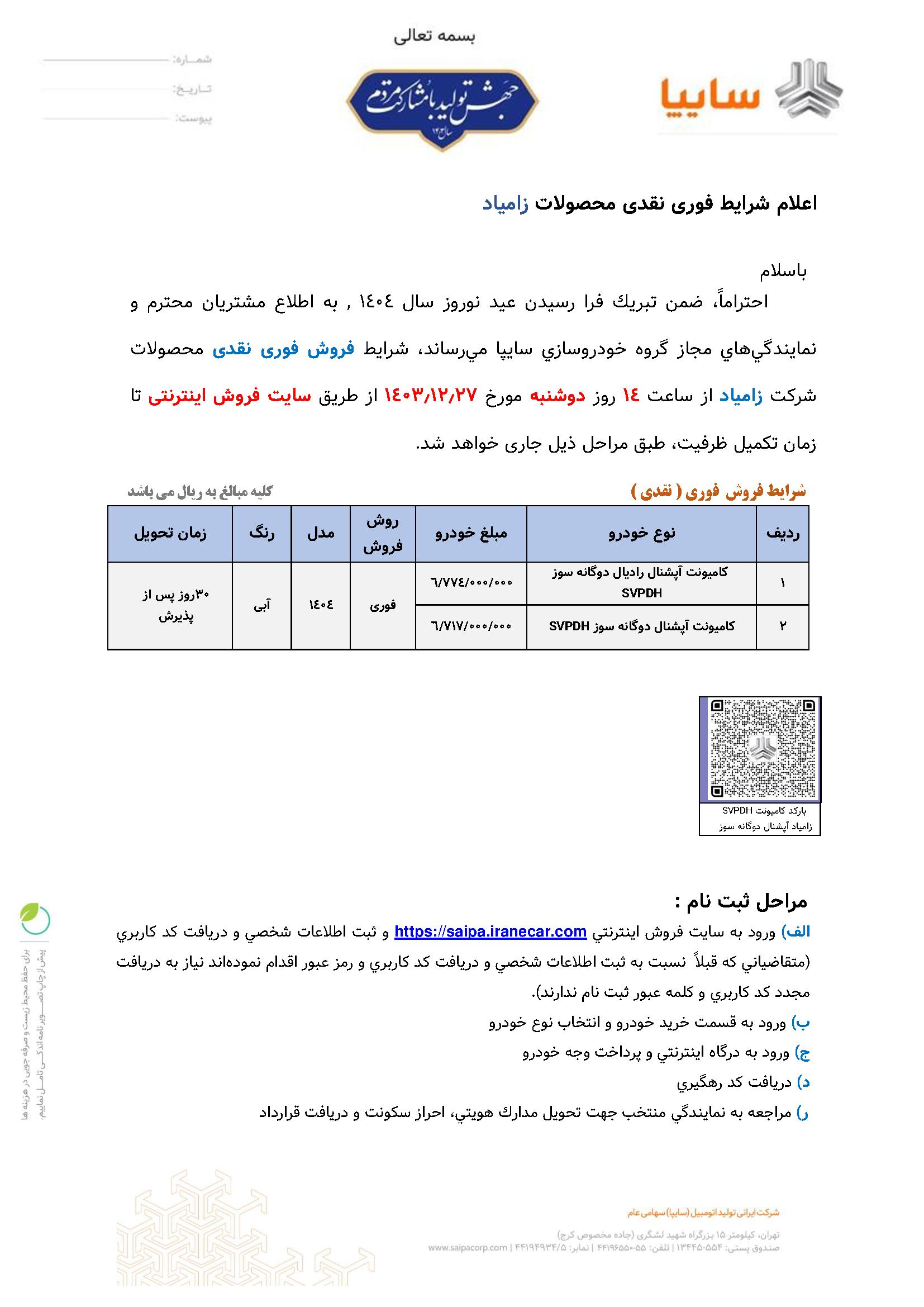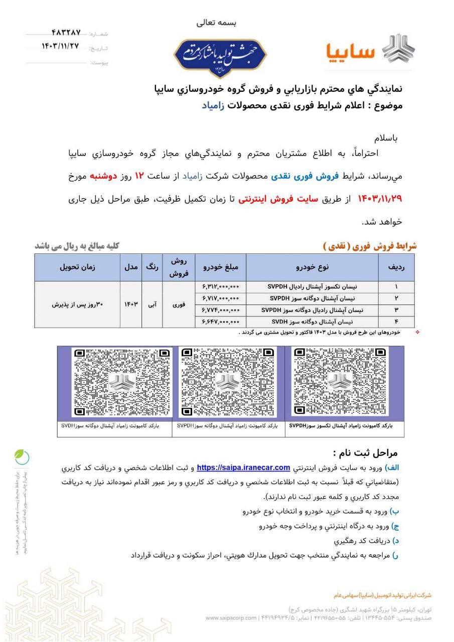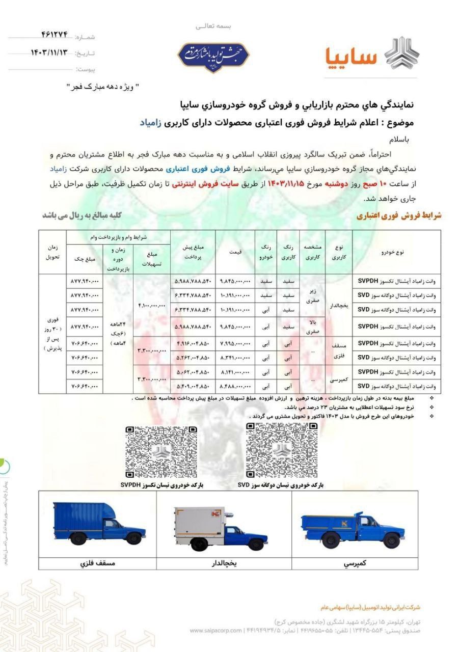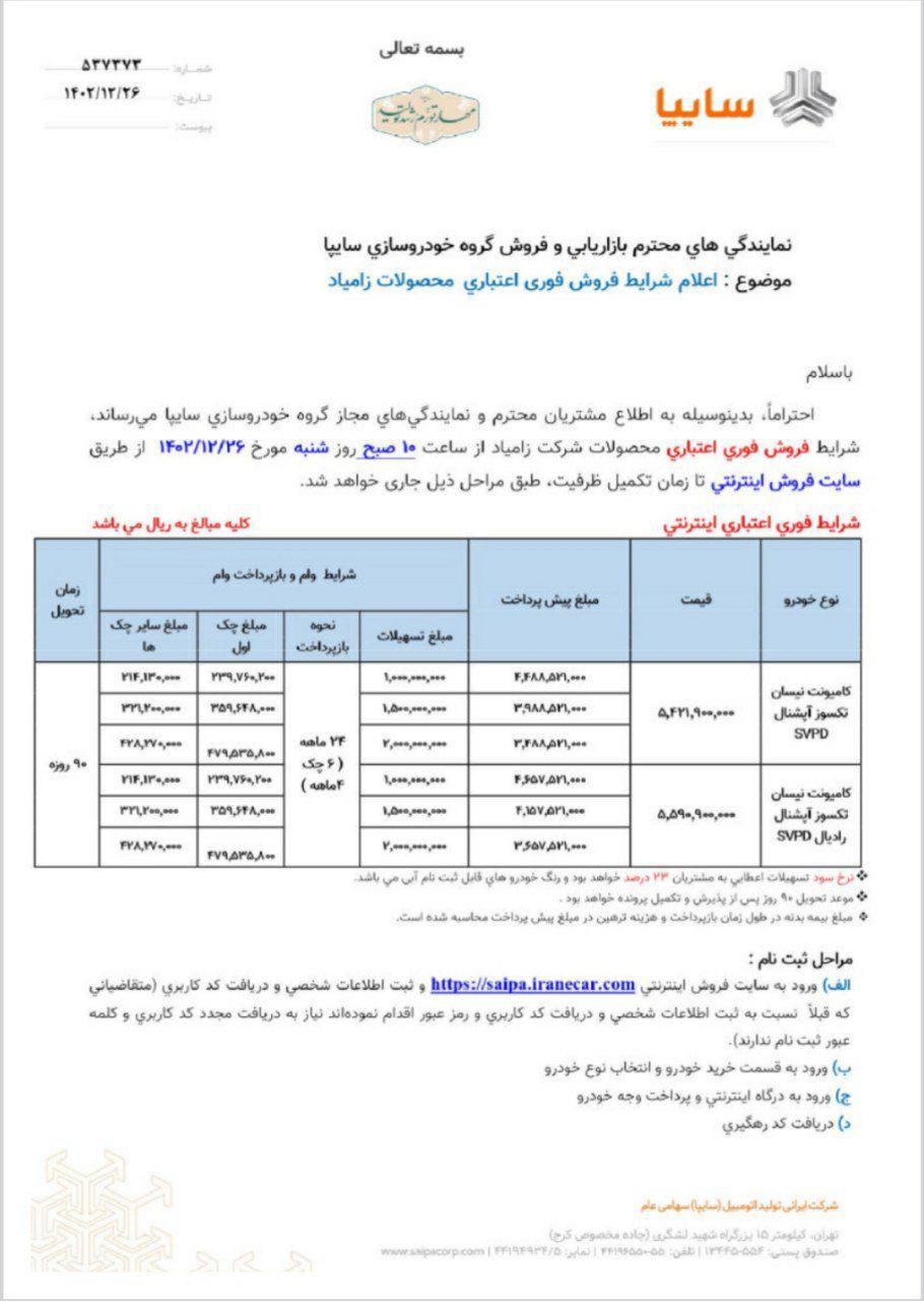 گروه خودروسازی سایپا خانواده محصول کامیونت نیسان تکسوز زامیاد را به صورت فروش فوری نقدی از روز دوشنبه مورخ 12//1403/09 از طریق صفحه فروش اینترنتی محصولات گروه خودروسازی سایپا به نشانی اینترنتی https://saipa.iranecar.com آغاز میکند؛ این طرح فروش تا زمان تكمیل ظرفیت فعال است.