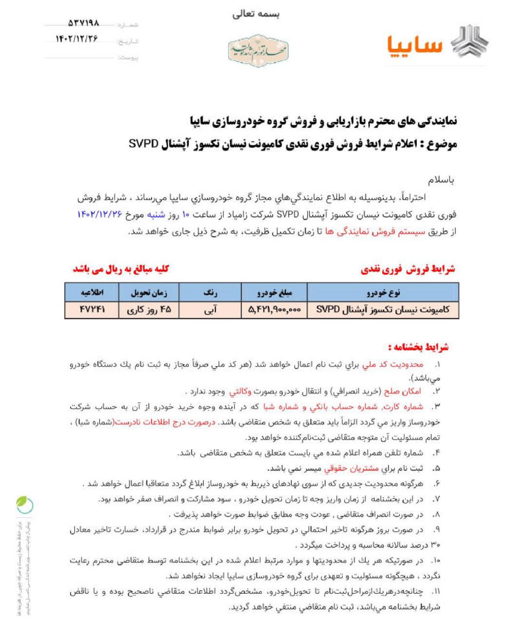شرکت زامیاد در جدیدترین شرایط فروش اعلامی نیسان تکسوز را بدون محدودیت از طریق وب سایت فروش سایپا از ساعت 10 روز شنبه 26 اسفند 1402 عرضه میکند: