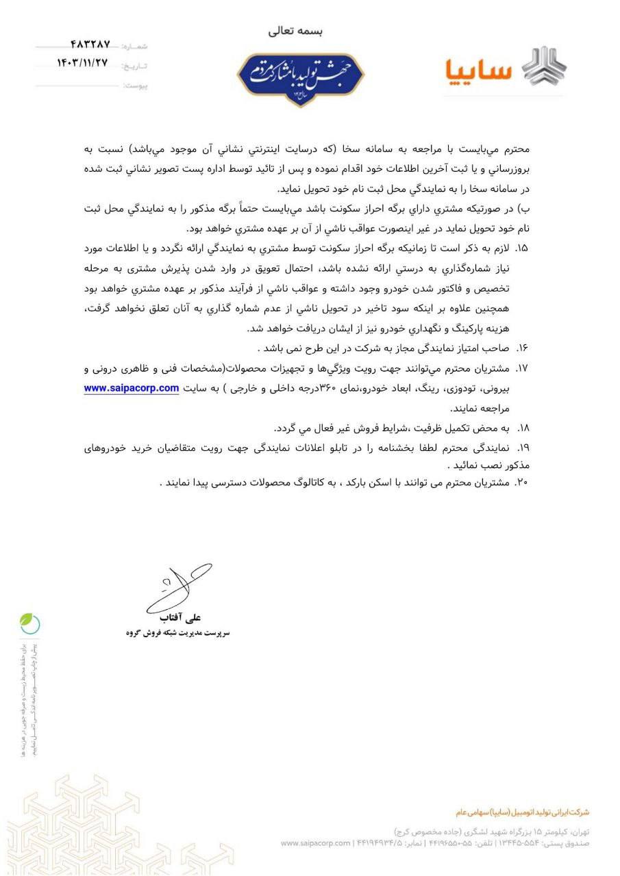 این فروش از طریق سامانه فروش اینترنتی محصولات گروه سایپا به نشانی اینترنتی https://saipa.iranecar.com انجام خواهد شد و تا زمان تکمیل ظرفیت ادامه خواهد داشت.